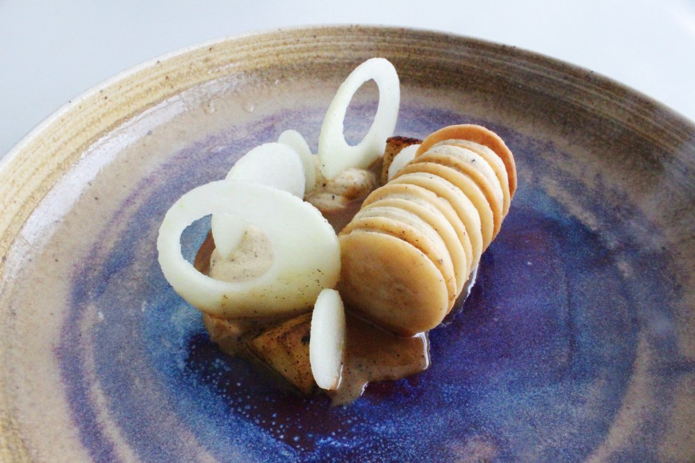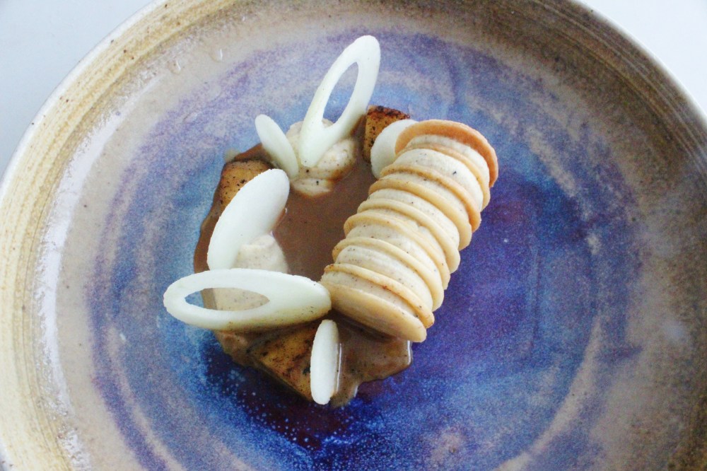 Shave the green apple on a mandolin. Cut into disks using circle cutters and store in cold salted water for plating.