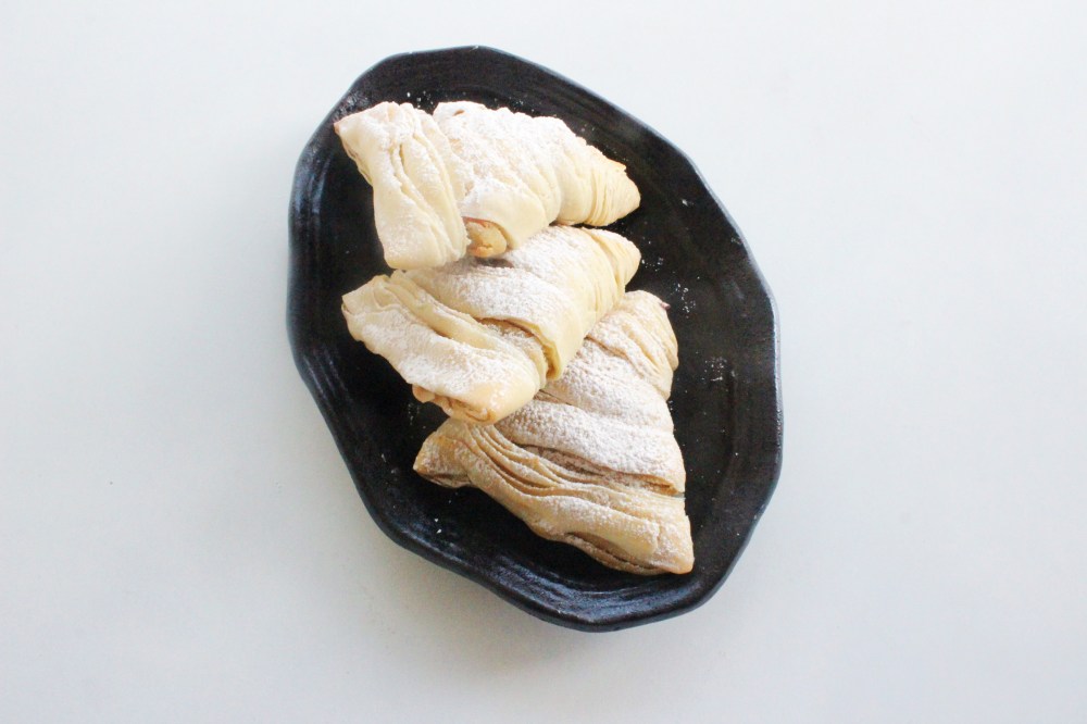 Brush the surface of the doughs with butter or lard and roll into a thick scroll, wrapping the additional pieces of dough around until all of the dough is used up. Chill down the dough for 10 minutes first. Then slice along the grain, forming 8 disks of dough. Gently press and flatten out the dough into a cup shape, and then add in about 3 tbsp of filling inside of the cone-cup-thing. Pinch the open side to seal the dough. Bake these pastries on a lined sheet tray, spaced 1-2 inches apart, at 400 degrees F for 25 minutes. Allow them to cool slightly before finishing with confectioner’s sugar to serve!