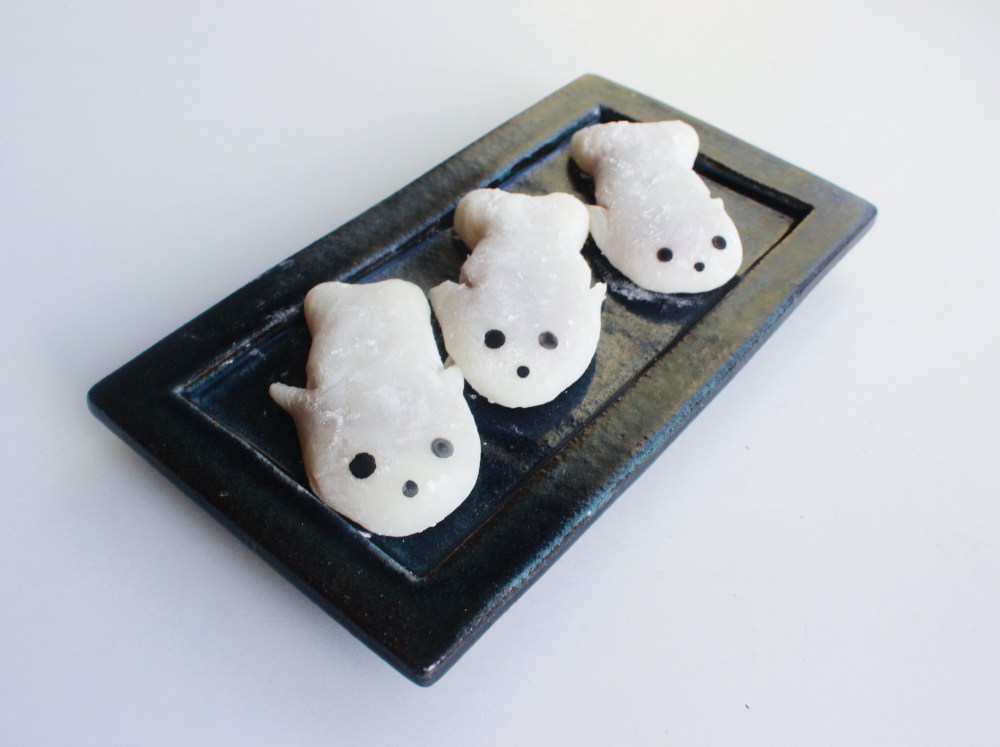 Place the filling into each piece of mochi, and pinch together the ends tightly to enclose the filling in the mochi. Shape into an ovular shape. Using either scissors or a small knife, cut the thinner end and the sides to form a tail and flippers. Brush with more starch so that those parts will not stick back to the mochi.