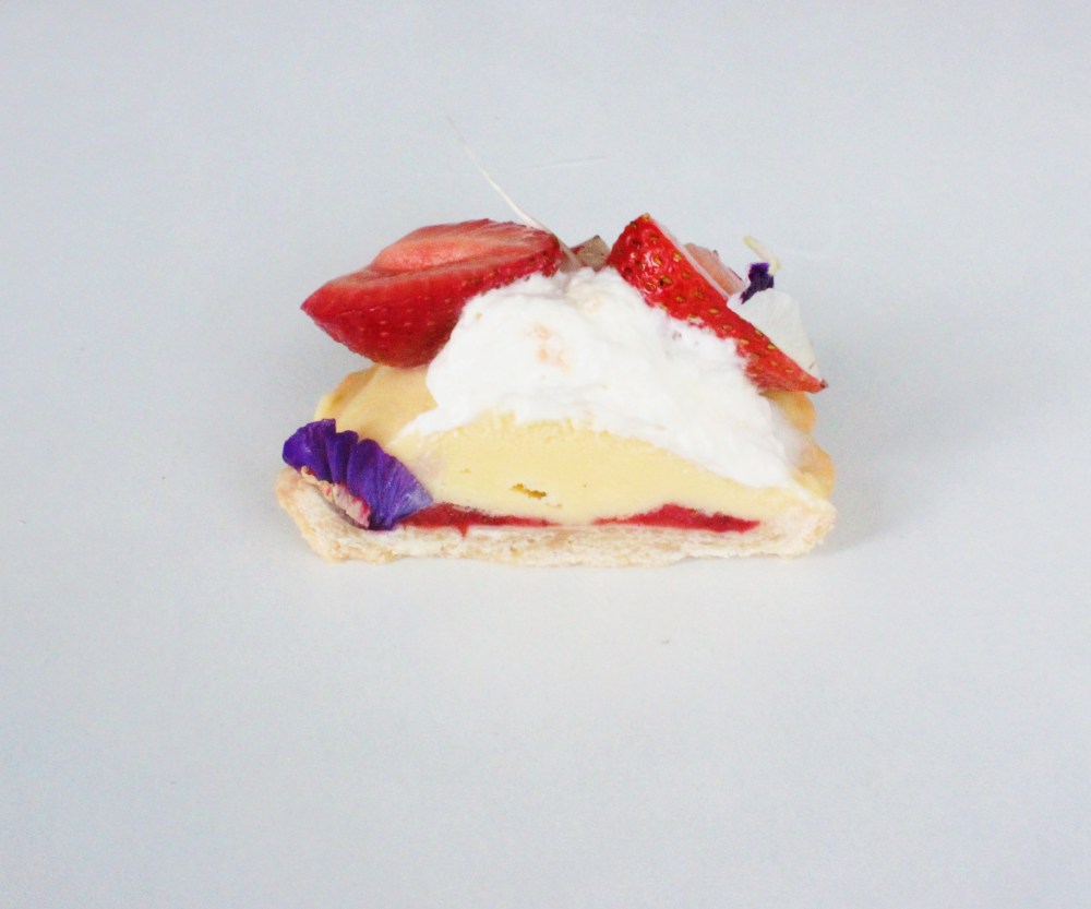 Start by pouring the jam into the bottom of the tart shell, allowing it to fill each tart about halfway-full. Then pipe on top of that the pastry cream, spreading it in an even layer on top. Pipe on top the chantilly cream, garnishing the sides with the strawberry slices. Finish with edible flower petals.