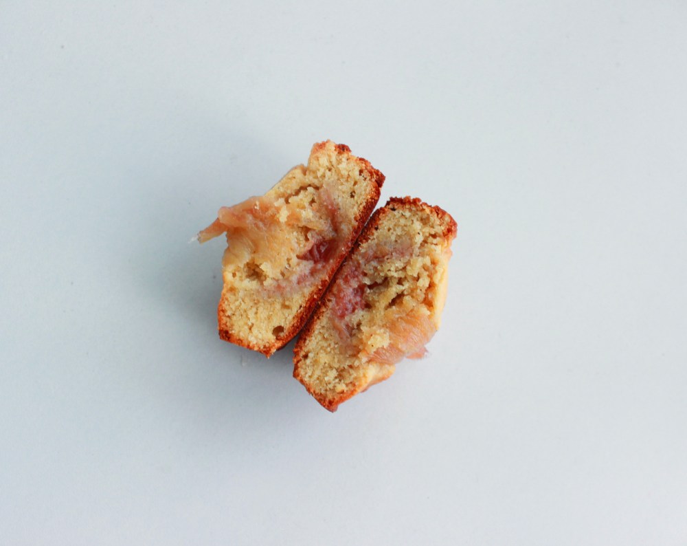 For this recipe, it is literally just two components. Poached rhubarb and the financier that we are embedding the rhubarb into. For the rhubarb, we are poaching them with a little rosewater and white balsamic, just to bring out the tartness even more, and some perfume-y notes. For the financier, we are whipping our egg whites with the poaching syrup, like an Italian meringue essentially(this way, we don’t waste our syrup!), and folding into that our almond meal, chickpea flour, and brown butter to form a batter. The usage of the chickpea flour adds an almost savory tang that plays off of the tartness of the rhubarb really nicely. That and it makes these financier effectively gluten-free! I happened to also have leftover rhubarb confiture from another recipe, so I went ahead and stuffed these little financier with those, just because it adds an extract bit of rhubarb to the final product! This recipe is essentially zero-waste, as everything is being used up to create these little spongecakes! I would recommend eating them for breakfast or with a cup of tea, though serving them with some chantilly cream, Greek yogurt, or even goat’s cheese is not a bad idea either!