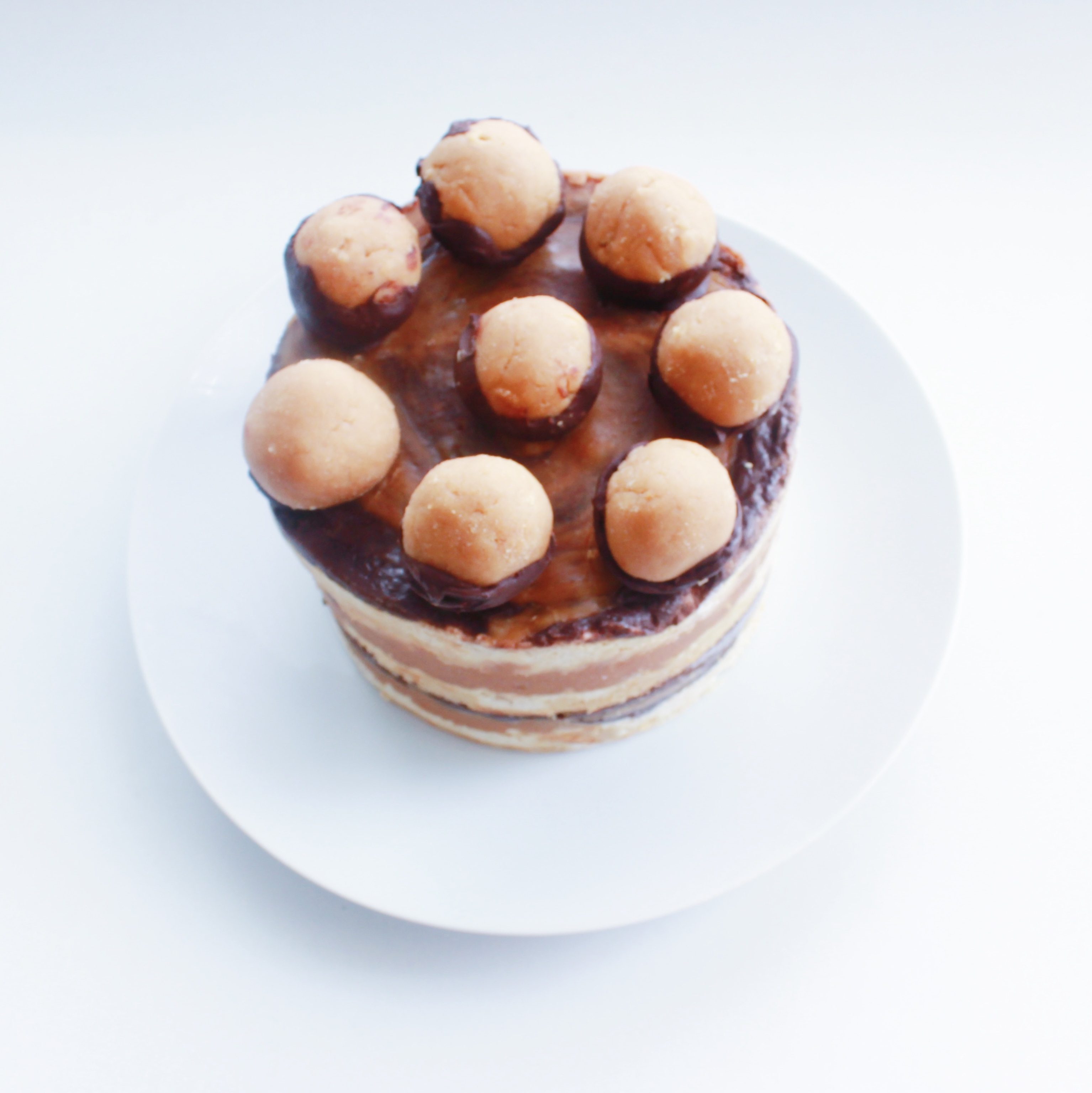 In a bowl, mix together the cake, peanut butter, sugar, salt, and vanilla to form your truffle base. Divide into 6 even balls and place in the freezer. Over a double boiler, melt down the dark chocolate until half-melted. Take the chocolate off heat and stir until fully melted. Skewer and dip your truffle balls into the chocolate, tapping the truffles to remove any excess – ideally you only want to cover the truffles about 1/2 to 3/4 the way up, leaving a clean circle of the peanut butter truffle filling exposed. Place the truffles, dipped side down, on either parchment or acetate, removing whatever skewer you used to dip them with, and place back in the freezer for at least another hour. Garnish the top of your buckeye cake with these truffles to finish.