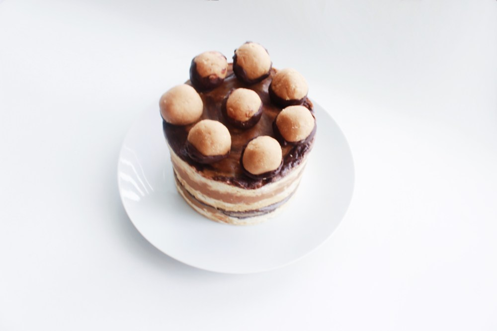 For the layers, we have a brown butter peanut cake, a vanilla soak, dark chocolate mousse, peanut butter-blonde chocolate ganache, and the buckeye cake truffles. The idea behind doing peanut butter in the cake instead of chocolate was because I wanted to use the cake scraps for the cake truffles, so if the cake was chocolate, then it would not be a true buckeye. That and using brown butter and peanut butter in the cake made for a wonderful combination, as the brown butter really accentuates the peanut flavor in the batter. I used blonde chocolate in the ganache(which you can sub with butterscotch chips), since the blonde chocolate’s caramel-y notes also pair beautifully with peanut butter to give the ganache a peanut brittle-like flavor! That and it is a perfect homage to the peanut butter fudge that a buckeye is made from. The chocolate components are obviously there to add the chocolate flavor in a buckeye, with the mousse being used instead of a second ganache because I wanted there to be some lightness to the dessert – everything is inherently heavy, so any sort of light, airy component was more than welcomed to break up the richness.