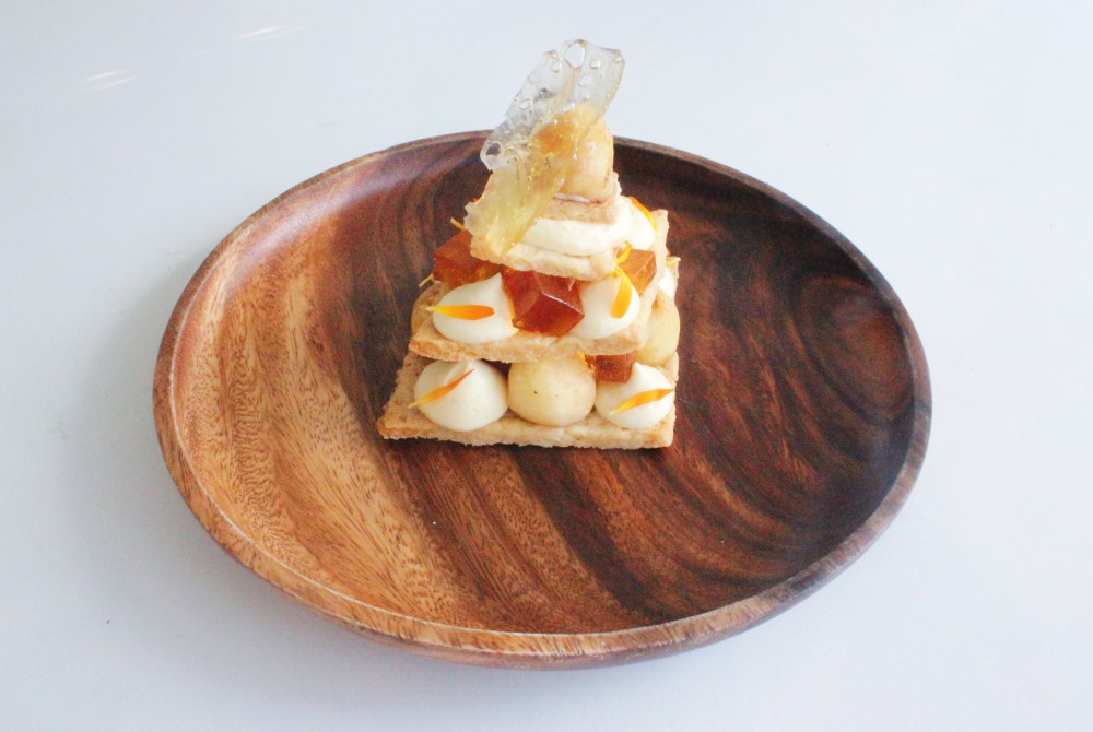 Start with the largest square of pastry. Alternate between pipings of the pastry cream and the apples, then dot between that the gelee. Repeat again and again and again, using less of each component to offset the fact each layer of smaller. Garnish the sides with your flower petals and the top with the bubble sugar to finish.