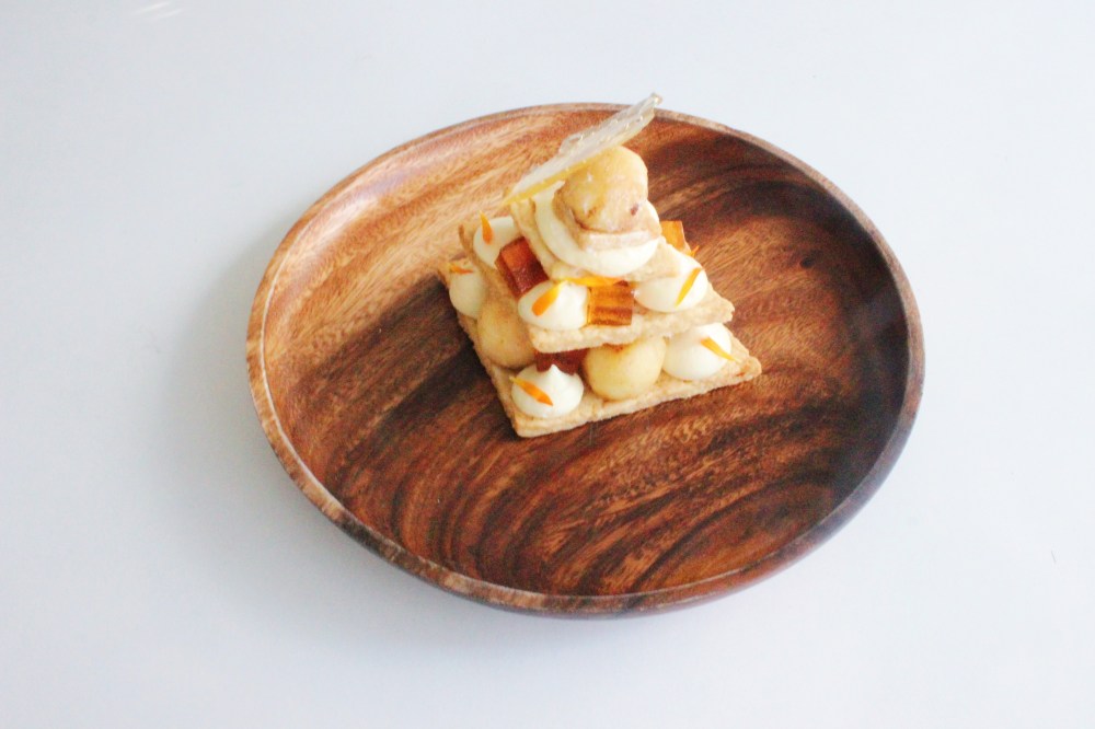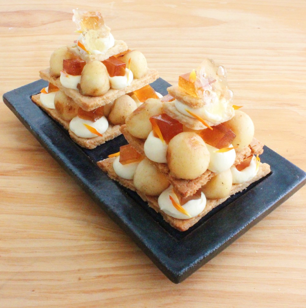 So I was fortunate enough to be gifted with a bottle of cinnamon tequila from the lovely Sheetal from Masterchef season 1, from her company, Spice Note Tequila, which features spice-infused tequilas! I actually love baking with alcohol, despite not being an alcoholic or even that much of a drinker(featherweight problems I guess), so I had a couple of ideas on what I wanted to do with it! Since alcohol evaporates when baked with, one major idea I had was to use it in puff pastry. Because the alcohol will steam off, that will create super flaky layers in any dough that has layers of it, so puff pastry just made the most sense with what to do with it. Either that, pie dough, or choux pastry would be the first three places where my mind would go when baking with booze. Will Napoleons and mille feuille are the most common usages for puff pastry, I figured I could go the route of mille feuille(a French dessert that is made with stacks of the butter pastry and pastry cream), but spruce it up a little and make it a little more fun! Thin circles of the puff pastry, little spheres of apples carved out with a 1980’s melon baller that are flambeed in the tequila, and some caramel gelee cubes infused with the tequila, and some bubble sugar made from the cinnamon tequila all round out this dessert and make it one to remember!