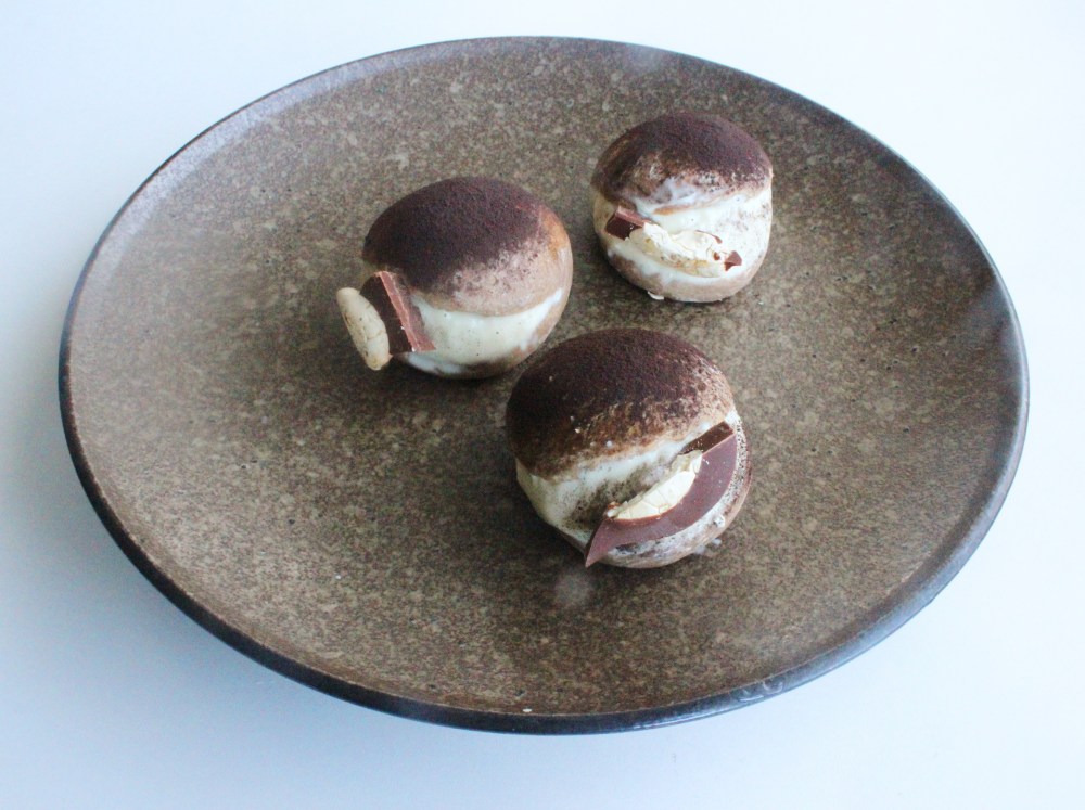 Dunk the buns in the soaking liquid first. Add on a scoop of the sorbet, then spread that evenly against the buns. Finish with pieces of dark chocolate and optionally a dusting of cocoa powder.