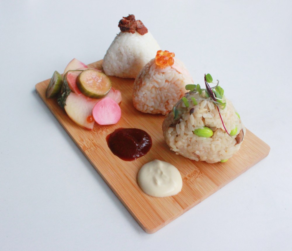 Going down the line, we have quite a few things here. The first are the three onigiri. The first is filled with soy-braised pork belly, topped with a little more of the pork belly on top. I used a pressure cooker to braise the pork belly faster on mine, though since we are dicing the pork belly, it should cook quickly regardless. For the salmon, we are roasting a salmon filet first, then tossing it with kewpie mayo and other seasonings. That acts as both the filling, and to season the rice with. And to be a little extra, the salmon onigiri are topped with ikura, or salmon roe. For the mushroom onigiri, the rice is actually cooked with dried mushroom stock, and tossed with minced mushrooms and edamame(soy beans) to give it more color. The filling is similar to the salmon, but using roasted king oyster mushrooms instead. And the balls are topped with microgreens just to give them a more “eat-your-vegetables” aesthetic. The two sauces were a ton of fun to make. One is essentially a tofu aioli, with olive oil, tahini, and garlic emulsified into the tofu to give it a nutty, rich, and somewhat punchy finish. The other sauce is a guajillo chili and tomato ponzu, designed to be smoky, sour, and sweet, and honestly, that sauce works REALLY well with the salmon. It’s an actual game-changer. The Japanese-style pickles include radishes, cucumbers, shiso(perilla leaf), and white peaches, just to add something lighter and fresh to contrast the heavier rice balls. I will suggest when forming your rice balls, keep a pot of cold water nearby, as dipping your hands into water between pressing the rice will keep the grains from sticking to you. Also, salting your hands before forming each ball is recommended as well, as that packs in seasoning onto the exterior of the rice!