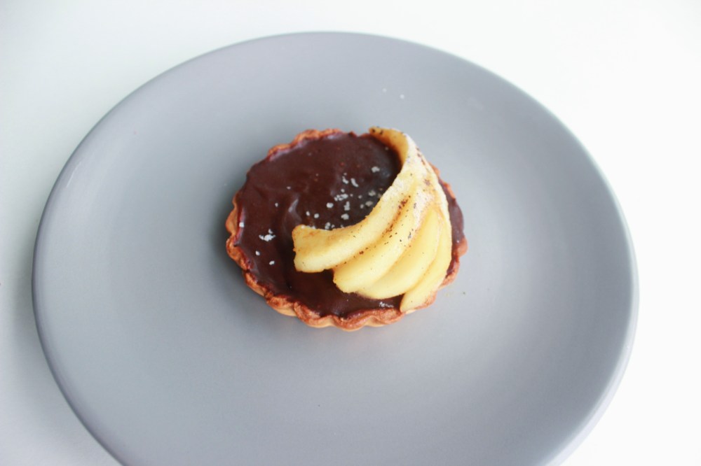 In a pot, heat up water, dark brown sugar, and miso paste and bring to a boil. Place the pears into the liquid and simmer with the pot covered until fork-tender, at least 4 minutes. Place the pears, round side down, onto a nonstick pan with some butter and sear on medium heat just to seal in the juices and caramelize the exterior. Allow the pears to cool down slightly before garnishing the tops of the tarts with. I preferred fanning out the pears before topping the tarts with, just to give them a little more movement and drama, but leaving them whole is not a bad alternative either!