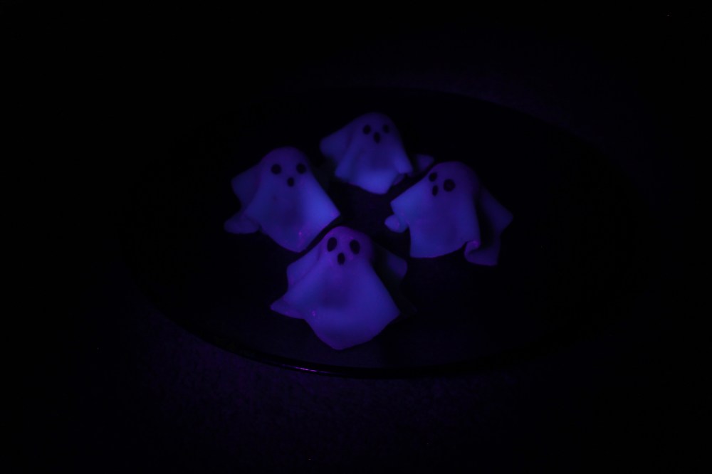 For the mochi batter, we are using the tonic water to make it glow in the dark. I found that substituting half of the glutinous rice flour(mochiko) out with shiratamako(another kind of glutinous rice flour, but more crystal-like in texture), resulted in a super soft, pillowy mochi. I had apprehensions at first to use tonic water in the mochi, since mochi has very little flavor on its own, meaning that the tonic water flavor should theoretically come through. Luckily, all of that rice and sugar somehow negated the gross chemical-y tonic water, so the end result was literally a traditional-tasting mochi. I would recommend rolling out the mochi using a rolling pin versus a pasta roller, because mochi can get sticky, and that can ruin your pasta roller. Don’t be afraid about adding too much cornstarch or potato starch, because you can always pat off any excess at the end. It’s better that your mochi ends up in one piece, rather than smeared over your cooking surfaces. I did use a square cutter when making these ghosts, because I was thinking about the shape of a blanket, but in retrospect, a circular cutter would have worked infinitely better for the final aesthetic. Beyond just the cut-out sheets of mochi, we are taking the leftover scraps of mochi, cutting those into rudimentary disks, and placing our red bean paste on that, just so that the red bean paste isn’t getting smeared everywhere as you transfer the ghosts from a cooking surface to a serving dish. For the eyes, I am dabbing those on the mochis with my vanilla-activated charcoal edible paint. Randomly enough, even though these mochi are inspired by ghosts, they are 100% vegan. So yes, ghosts do count as a vegan-friendly option.