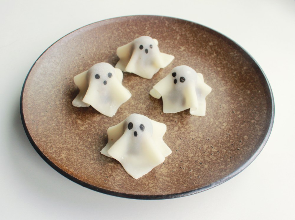 Mix the two ingredients together to form an edible paint. To assemble, start by taking 3-4 tbsp of the red bean paste and forming them into a small, hill-shaped mound. Drape the mochi over the red bean paste, and press on the eyes and mouth of the ghost using the large and thin ends of a chopstick and the edible paint you just created. For a fun effect, using a black light to make these little mochi ghosts glow!