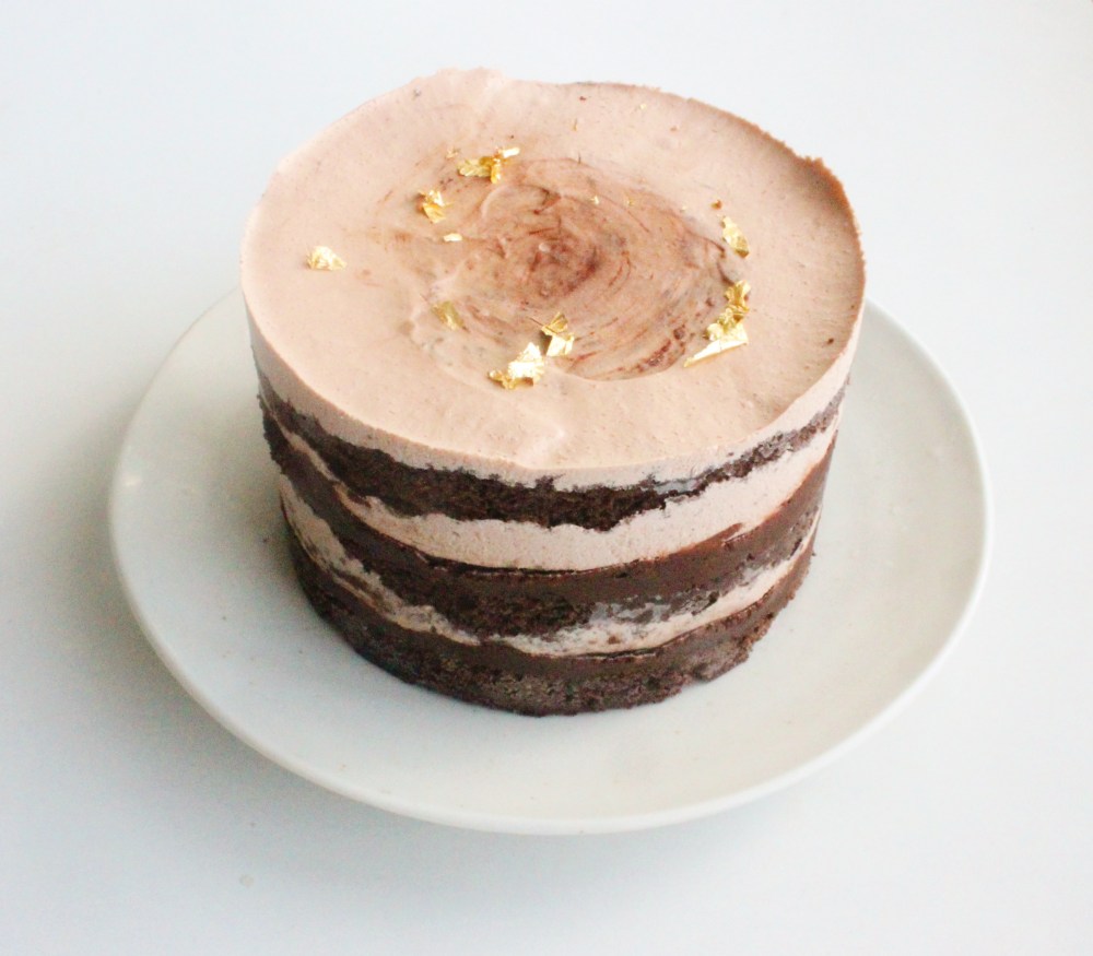 Line a 6-inch ring mold with acetate. Start by placing down the scrap layer of the cake. Add in 1/3 of the soak. Add in 1/3 of the ganache first, then pour in 1/3 of the Nutella mousse. Repeat these steps again, using one of your normal 6-inch cake rounds in place of the scrap layer. For the last layer, start with the cake round and the soak, then pour on the mousse. Swirl into the mousse the remainder of your ganache. Then transfer to a freezer and allow the cake to set for at least 3 hours before attempting to unmold. Finish with gold leaf.