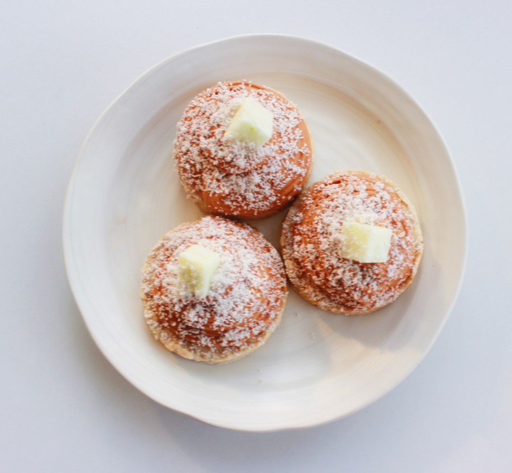Place a cube of apple down on top of each cake. Pipe the cream in a dollop on top of each cake, covering the apple cube. Pipe the namelaka mousse around the cream. Top with the cube of apple, and a dusting of the confectioner’s sugar to finish.
