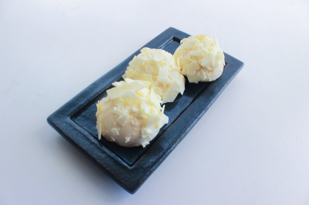 Other options if you do not want to do all of that is either purchasing white chocolate curls or buying a large white chocolate bar and going at it with a vegetable peeler! In all cases, keep the chocolate chilled so it does not warp and melt. Sprinkle it over the mousses liberally just to coat them in the shavings and give them the appearance of a snowball.