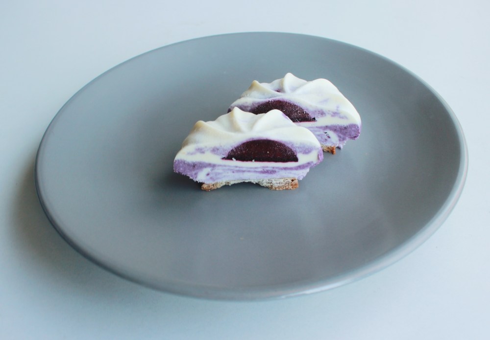 This recipe hilariously came about because I had leftover blueberry gelee cores(from my Jigglypuff recipe), leftover white chocolate shavings(from my lemon-white chocolate snowballs), leftover goat cheese(from my pumpkin toast recipe), and leftover shortbread dough(from my Oshawott cheesecakes). Before anyone asks, since all of these recipes were clearly posted months apart, yes, I do make content literally months in advanced. I find that if an idea comes to me before it is seasonally appropriate, I would create it, and then set up the recipe to be published whenever it is most fitting – hence why I actually had all of those components/recipes ready at around the same time, despite them all being posted literally over the span on 6 months. So this recipe was the literal Frankenstein brainchild that specifically was made to utilize literally everything leftover I had hanging around in my fridge/freeze, bringing them all together into a cute, cohesive cheesecake of all things! It just made sense to go this route, since we had goat cheese, white chocolate, blueberry gelee, and shortbread to act as the base. And that was literally how this all came about. I also used some Yuzu Inspiration in the mousse, just to add more tang to the goat cheese, made a yuzu-vanilla whip on top, and garnished the whole thing with some blueberry tuiles, just to tie everything in together with the blueberry being used in the core of the cheesecake.