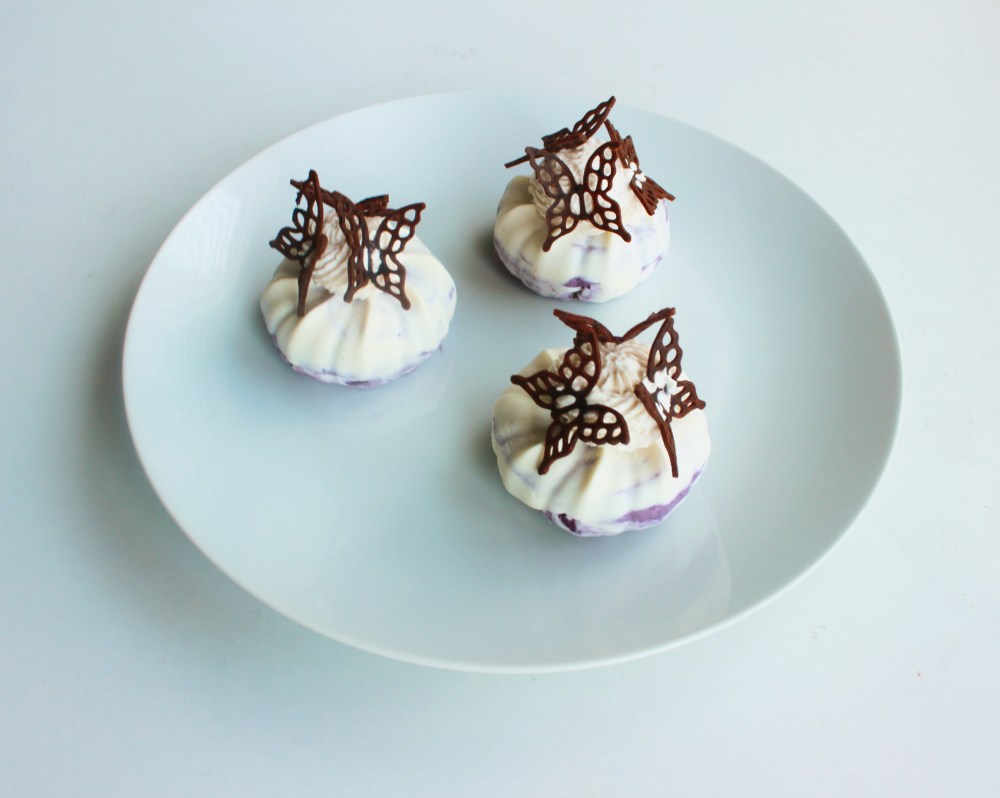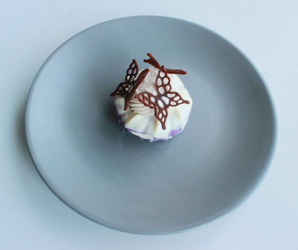 Pipe the chantilly on top of the cheesecakes. Garnish with the butterflies to finish.