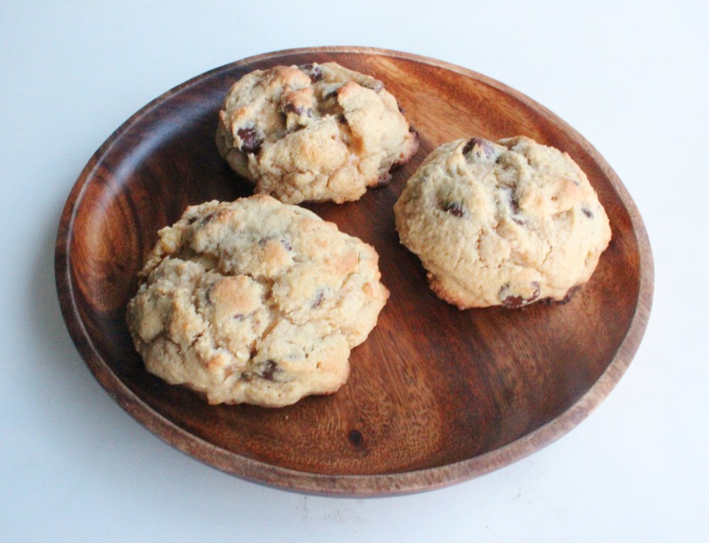 The key to nailing these cookies is the technique. I used a green handled ice cream scoop to scoop 6 reasonably large mounds of dough. I also made sure to refrigerate them, just to guarantee that the insides of the cookie stay nice and cold – you want it to be almost like dough in the middle still! These cookies bake at a high temperature for a shorter amount of time to achieve that signature Levain gooey interior – most cookies bake at 375 degrees F for 15 minutes, these bake at 425 degrees F for 10 minutes instead. Since these cookies are gluten-free, they need time to properly cool down before you could even remove them from the baking tray. Attempting to do so prematurely will result in the cookies falling apart in your hands and turning into a bizarre half-baked dough puddle. So I recommend throwing them straight into the freezer from the oven if you wanted to eat one right away. While these are 100% gluten-free, it is not really that detectable – all of the butter, sugar, and eggs make 100% certain of that!