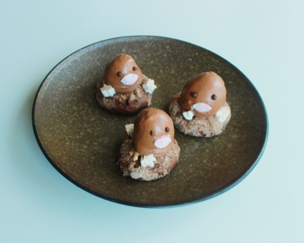 When I think back to Generation 1 of Pokémon, one of the funniest designs for me is Diglett. It’s supposed to be like a living whack-a-mole situation, and it looks like a brown bump with eyes, a pink nose-mouth-thing, and it is just sticking out of the ground. It apparently has legs and an actual body beneath the surface, but nobody has ever seen it before. And then we have the evolution Dugtrio, which is just three Diglett stuck together. And don’t even get me started on the Alolan Dugtrio, which features three long sets of golden, wavy hair. Purely iconic. Or the new Pokémon, Wiglett, which is said to be similar to Diglett, but not a Diglett outright, being based on a garden eel and being a long, white Diglett that might not even be a mammal. But anyways, since Diglett has such a simple design, being a brown bump sticking out of the ground, I figured that would be a fun yet simple thing to replicate into pastry! I went with a Rocky Road theme, using chocolate, almonds, and marshmallows, just to pay homage to the fact that Diglett is perpetually sticking out of the ground. And what better dessert for a Diglett to be sticking out of than a baked doughnut? So that was where I went with this dessert!