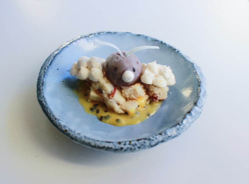 With the base of the dessert/the body of Swablu, I made that using the banana soft serve. I dyed the ice cream blue using blue spirulina as well, just to better mirror the color of a normal Swablu(you can also use a little turmeric powder instead of spirulina if you want a shiny Swablu, which is yellow!). The usage of blue spirulina is also a fun homage to the tropical nature of Hoenn as well, since spirulina is a kind of seaweed, and you can actually go diving in Hoenn! I also made tempered white chocolate curls, dyed blue with the spirulina, to represent the feather tufts on top of Swablu’s head. The Swablu itself is sitting on pieces of banana milk chiffon cake, that are studded with pecans, as an homage to hummingbird cake, which is usually a denser banana cake with the pecans in it. I went the chiffon route, just to give it a lighter cotton-soft texture, as a reference to Swablu being the Cotton Bird Pokemon. For Swablu’s little wings, we made those with a whipped cream cheese that was covered with coconut flakes to better resemble wings, while also trying in with the flavors that go into a hummingbird cake. In lieu of pineapple, I used passionfruit to add a little texture and acidity, and made a curd with that. Overall, this sundae came together quite nicely. I will admit I let the ice cream sit too long in the freezer after churning it, which is why the color darkened so drastically, but I still found the flavors to be perfect for anyone who is into hummingbird cake or tropical fruit in general!