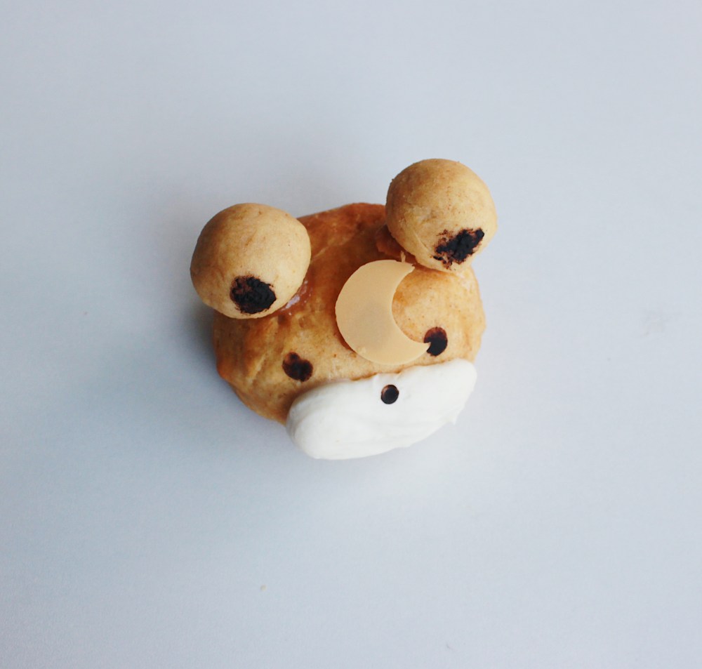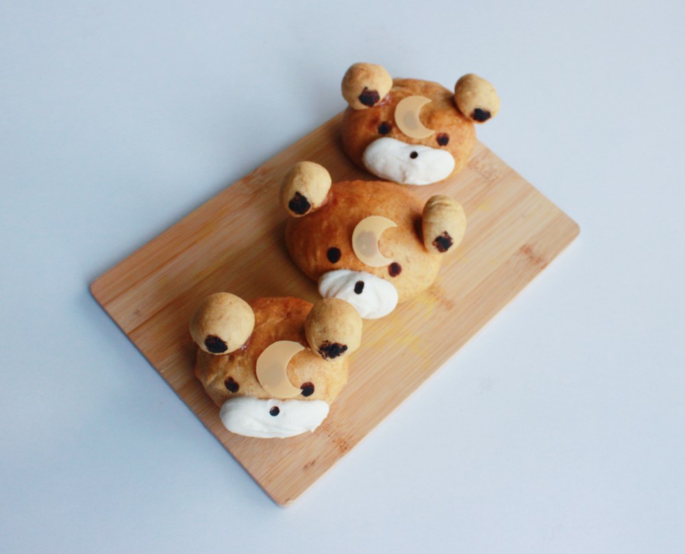 Pipe the honey cream onto the buns to form Teddiursa’s mouth. Use a small amount of the ganache to glue the blonde chocolate crescents onto Teddiursa’s forehead, and the ears onto the head. In a bowl, mix the charcoal with clear alcohol to form a “paint”. Use the ends of chopsticks to paint on the eyes, ears, and snout on each bun. Drizzle some honey on top of the buns to finish.