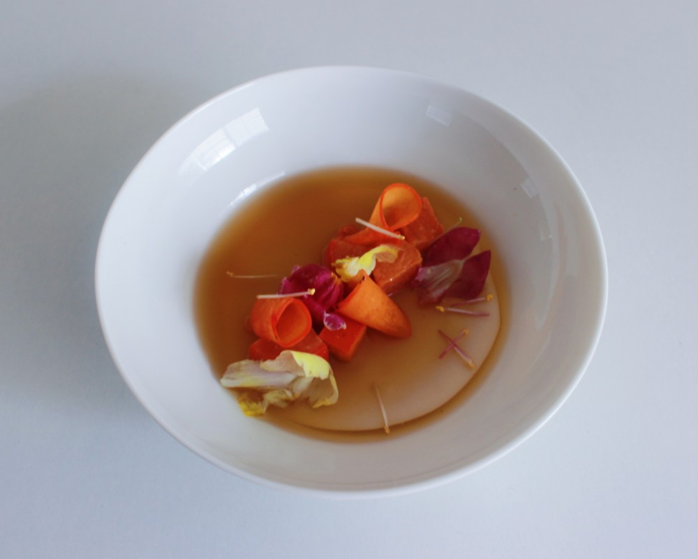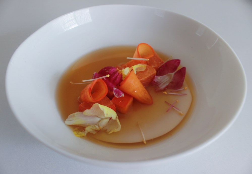 Peel the persimmon and cut in half along the length. Slice into ribbons on a mandolin and toss with the other ingredients. Store in an airtight container prior to plating.