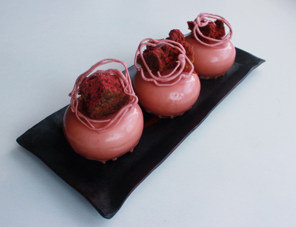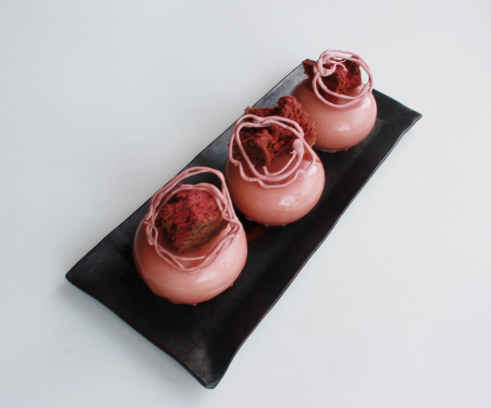 Place the still-frozen petit gateau on an elevated surface – I used flat-ended piping tips, although tall and small cookie cutters work nicely here too! Pour the glaze over the petit gateau, allowing the excess to drip off the sides and for the glaze itself to firm up – roughly 2-3 minutes after pouring the glaze should suffice. Transfer the glazed petit gateau to your desired serving surface, and then garnish the tops with the micro-cake, then the ruby chocolate to finish.