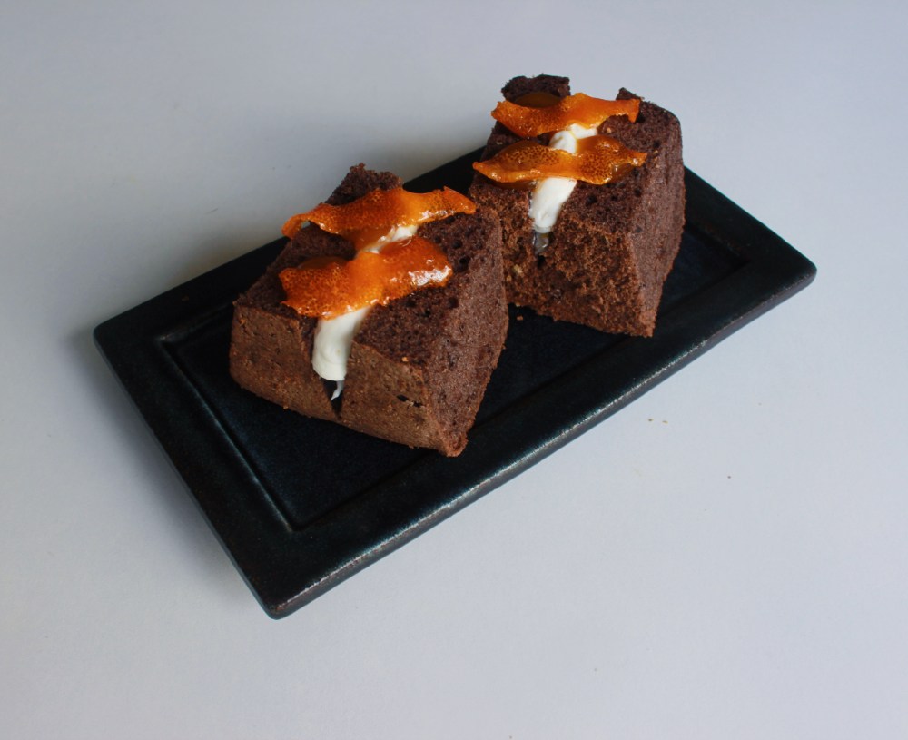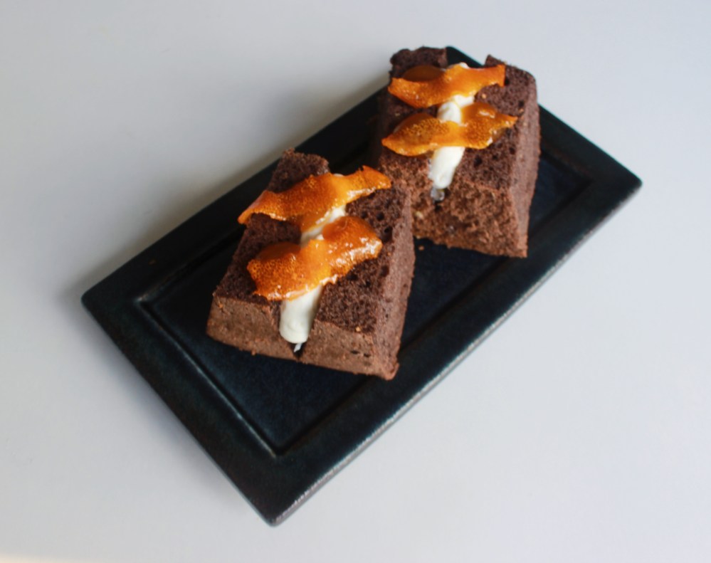For the components, we have the chocolate chiffon cake, orange curd, chantilly cream, and candied orange peels to finish. I will admit that in the picture, I used satsuma mikan, although that is not readily available and is a winter citrus, so using normal oranges just perfectly acceptable as well! For those unfamiliar with a satsuma mikan, they are these bright orange tangerines that are popular in Japan, and readily available in the fall/winter. These tangerines have a mild flavor in the juice, and the real citrus notes come from their zest, which was why I felt the need to candy the peels for the garnish! I will admit that chocolate is a slightly less represented flavor in these sandwiches, but the logic behind that was because chocolate can be very overpowering, and just to make sure that the citrus came through more, I wanted to limit the chocolate to just the light sponge, so then the mikan could add bright notes that really highlight the fruitiness of the black cacao powder I used. You can garnish the tops of these cakes with some dark chocolate shavings or something as well, but in my case, I wanted to really highlight the satsuma mikan as well.