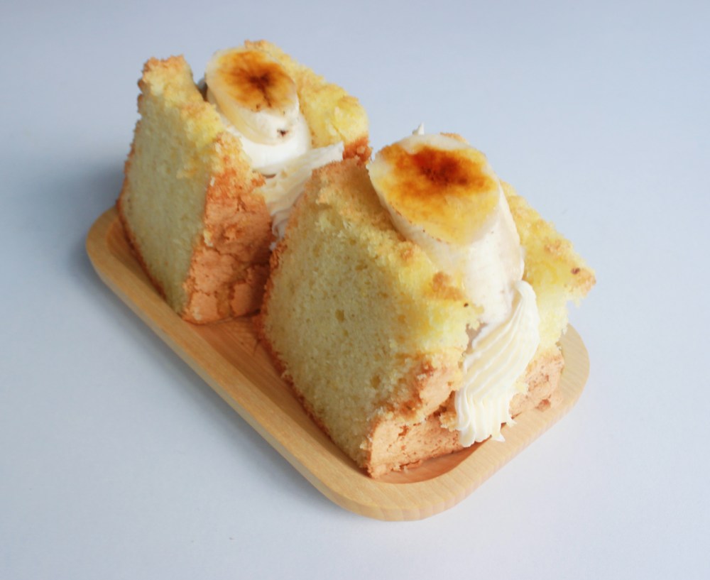 For the components, we have a kinako chiffon cake, ripened banana custard, honey cream, and bruleed banana slices. For the banana custard, just to be funny, I used Korean banana milk in place of normal milk, since it will reinforce the banana flavor, even if it is an artificial banana flavoring. With the honey cream, I felt like honey would be a pleasant contrast to the kinako and the banana, adding a slight complexity and bitterness to the nutty toasted soy bean flavor and the pleasantly sweet and creamy banana custard. I also bruleed some banana slices to add as a garnish on top, just for a gorgeous visual on top of the dessert, and to let it be known that this is a banana dessert more than anything else! If you do not own a blowtorch, you can also broil sugar onto banana chips in your oven. The broiled sugar banana chip was what I used to do in lieu of bruleed banana slices when I was not a proud blowtorch owner(thank you, Renee Wang and Samantha Daily for buying me one at different points in my life, because I would definitely not have done that myself!).