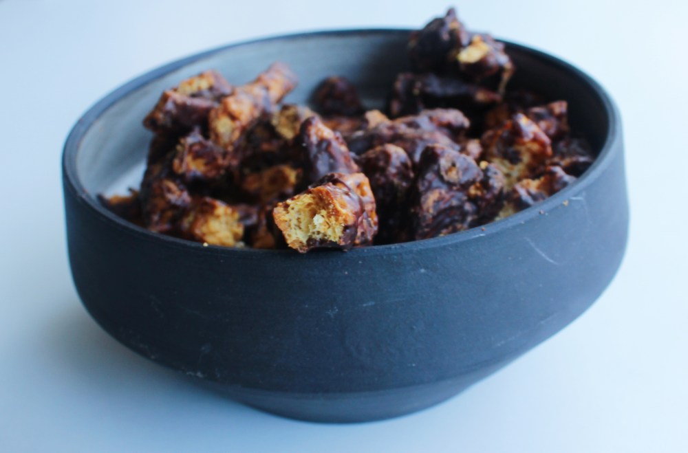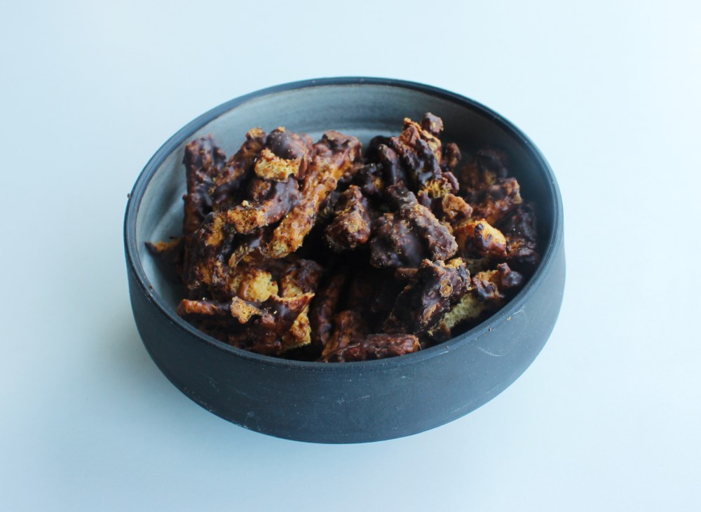 For this recipe, it is relatively straightforward. You got to toast bread, pour toffee on it, re-heat it so that the toffee melts down so that you can toss the bread in the melted down toffee for a more even distribution of caramel to bread, and then toss the still-warm toffee-covered bread sticks in chocolate so that the chocolate just melts around the sticks. The biggest technical step in this recipe is making the toffee. You need to really use your eyes(and/or a thermometer that can tell you when the sugar registers 315 degrees F) just to make sure you know when the sugar begins to brown. Once the sugar starts to turn an amber-gold color around the edges, add in the butter and salt to that and stir on low heat. The key here is that you want the milk fat and solids from the butter to cook out and emulsify with the caramelized sugar to form almost like a thick caramel sauce. That is what you’re looking to pour over the bread. And don’t worry if the distribution is not even at first. When you bake the bread a second time with the caramel coating, the caramel will loosen and then you can stir the bread around in the now-liquid caramel to even coat it. From there, the rest of it is a waiting game. Waiting for the bread to toast, waiting for the caramel-bread to re-toast, waiting for the chocolate to harden before transferring everything into an airtight container. All in all, a fairly simple list of ingredients, and you will have a very addictive snack that highlights something most people would discard.