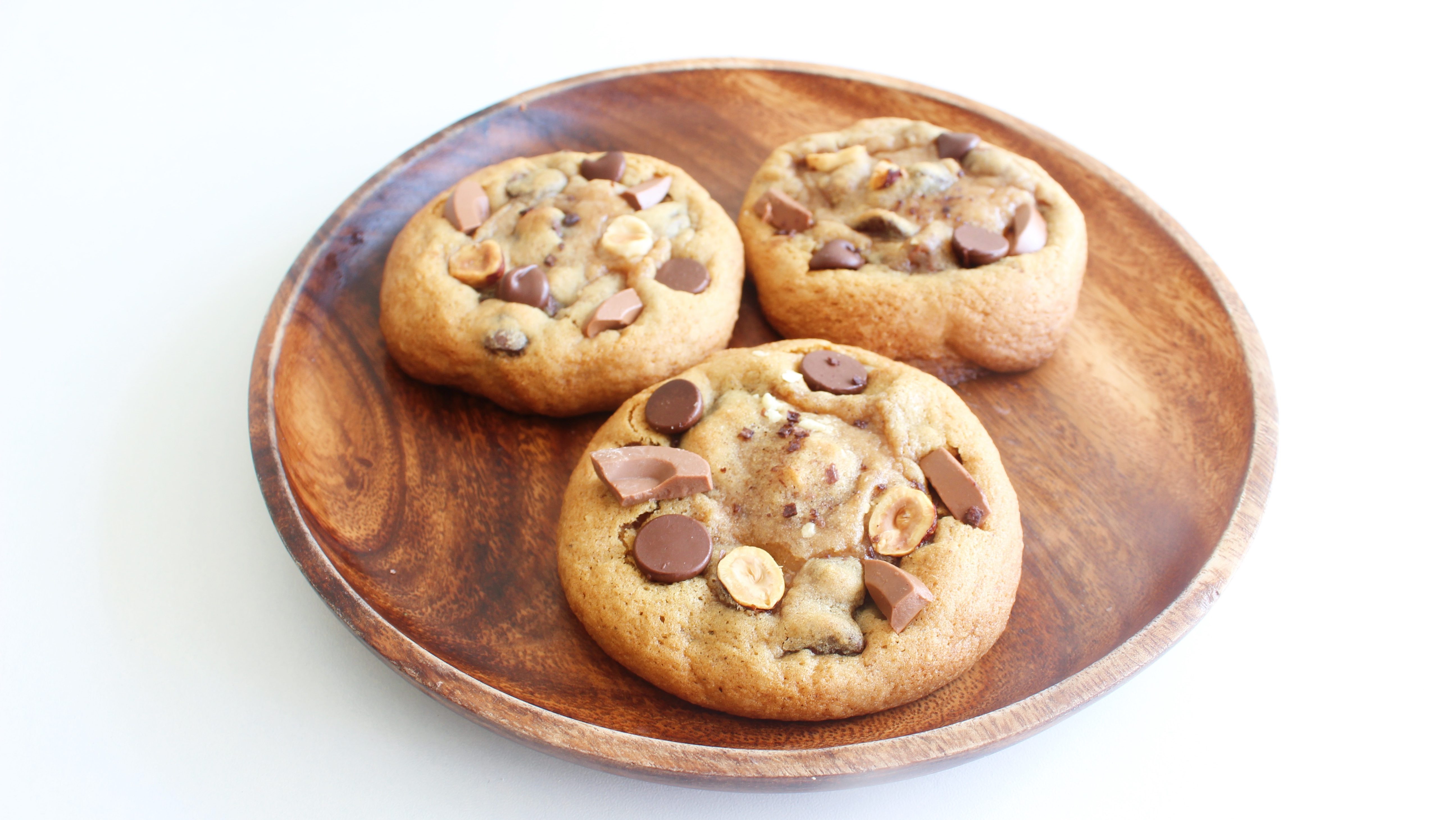 In a pan, heat up the butter until browned. Take off heat and stir in the malted milk powder. Then pour the liquid into a mixing bowl. Start by whisking the eggs into the butter, then the vanilla, and lastly, the sugar. Continue to whisk the mixture until it is pale brown in color. Fold into that the ground hazelnuts first. Then sift in the all-purpose flour, baking powder, baking soda, and salt. Lastly, fold in the Valrhona Azelia, dark chocolate chips, and most of the coarsely chopped hazelnuts. Refrigerate the dough for at least 1 hour. Scoop the dough, using a blue-handled ice cream scoop, and press the frozen Nutella filling into each dough ball, making sure that the dough is completely surrounding the Nutella – if this is not the case, the Nutella will just leak out from beneath the cookies and make an expensive, but delicious mess. Press into the tops of each cookie some more coarsely chopped hazelnuts. Freeze the cookies for at least 15 minutes. Space the cookies out on a lined sheet tray, keeping them at least 2 inches apart – use another sheet tray if necessary. Bake at 400 degrees F for 10 minutes. While the cookies are still warm, you can round out the edges using a circular cookie cutter. Working quickly while the cookies are still soft and warm, press pieces of chocolate on top, and sprinkle over that the finishing salt.
