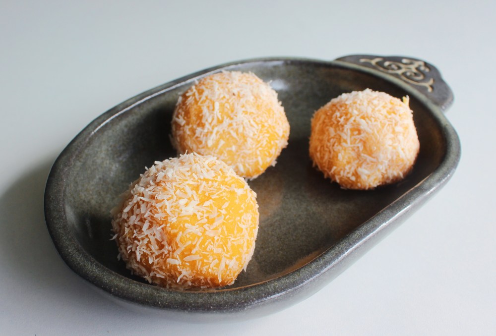 Mix the first four ingredients together into a batter. Divide the batter between two bowls that were lined with cooking spray, and steam 20 minutes. Take the bowls and place onto a wetted cutting board. Divide the mochi into 16 pieces. Wrap each piece around the fresh mango, and roll in the coconut flakes.