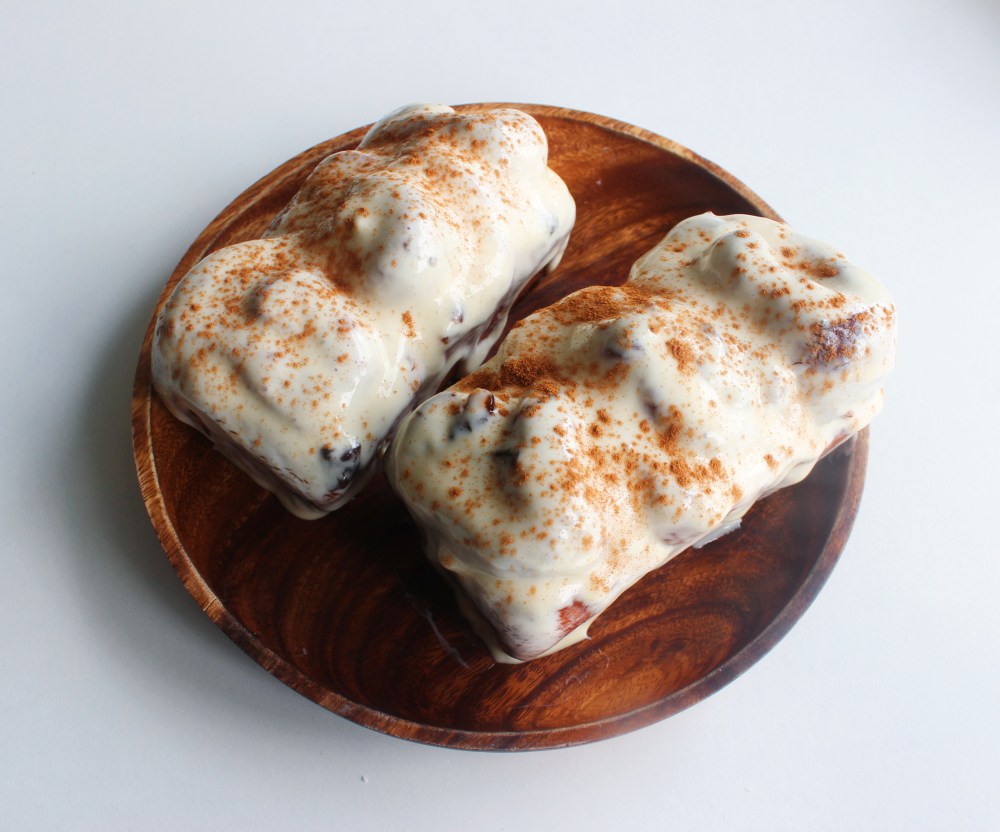 Bake at 375 degrees F for 35 minutes. While the loaves are still warm, pipe on and spread the frosting. Alternatively, you can store the cooled down loaves in an airtight container, then reheat them in the oven or microwave before applying on the glaze.