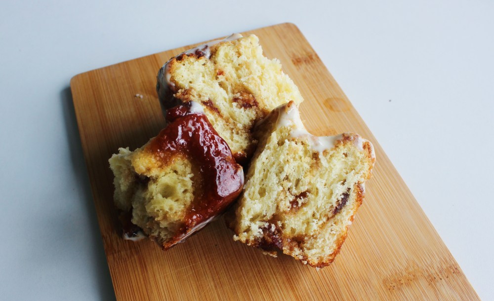 Now for the recipe. I took the term “Cinnabon crew” and kind of ran with it, by baking three individual cinnamon rolls together in a single mini loaf pan. The end result was pretty amazing, not going to lie here. These loaves are great if you love the gooey centers, because they feature three gooey centers per loaf! I was really fascinated at the concept of Cinnabon’s gooey Center of the Roll, and I felt like these loaves embraced that pretty well. And if you love the crispy baked edges in a cinnamon roll, you get those as well, since the loaves are basically all-crispy edge, being a baked into a rectangular shape, and all-gooey center, so it’s really the best of both worlds! The dough itself is a yeasted flour dough that uses eggs, brown sugar, and milk to give it a silkier texture. Instead of using butter, I went with canola oil, since that will keep the breads from drying out faster. Even though they take longer to make because of the resting periods, yeasted bread doughs are my personal preference to baking powder/soda-based bread doughs simply because yeast-leavening results in a softer, pillowy crumb structure. That fact is especially true in doughnuts, but also can apply to breads(i.e. Irish soda bread, which is delicious but slightly crumbly, compared to a brioche, which is springy and light). The loaves are lined with a layer of date-brown sugar-cinnamon “goo”, which perfumes the soft bread dough with a distinctly sweet aroma. I used bourbon in my filling, since that will play off of the vanilla and brown sugar nicely, although using just milk works here too. I also made a thinned out cream cheese glaze, which I dusted with some cinnamon, just to give the loaves a more Cinnabon-Starbucks barista-kind of feeling.