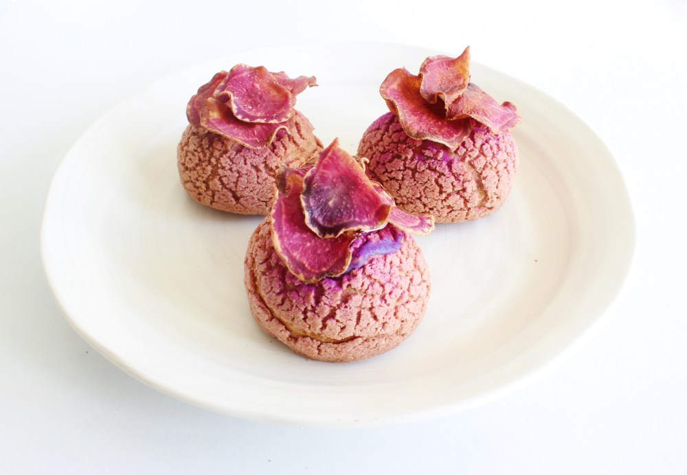 Pipe the purple yam mousseline into each puff. Top the puffs with a dusting of the yam powder, then pipe on the miso cream, and finish with the purple yam chips.