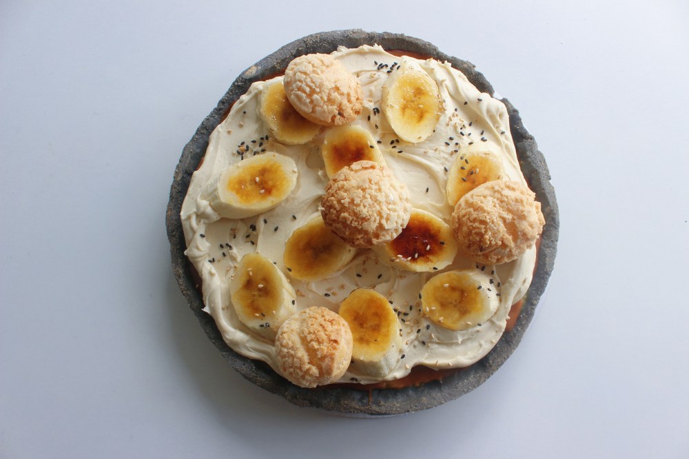With the components, we have a black sesame pate sucre, acting all the shell and base of the tart. We also have an Injeolmi-banana custard in the middle. Injeolmi is a Korean grain blend, that has these warming, toasty, nutty notes to it, which plays off the sesame nicely. I have made banana desserts in the past, and I try to also use turmeric in them, just to keep the color consistently yellow – naturally banana-flavored components tend to turn this gross off-brown, off-gray color that is unappetizing, so I am using the turmeric to really counteract that. On top of our delicious and not-grossly colored banana filling is a layer of tahini-oat milk butterscotch. And on top of that, an oat milk-injeolmi mascarpone. And then on top of that, we have slices of bananas that we bruleed with sugar, little oat milk-infused cream puffs(called choquettes), that are encrusted in a sesame cookie, and a sprinkling of sesame seeds, just to add fun homages to what is in the tart itself.
