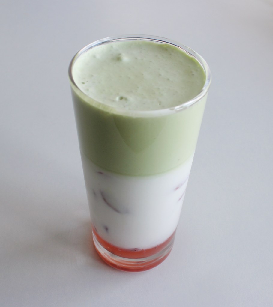 To balance the tang, creaminess, and sweetness from everything else, I’m topping all of that with matcha foam, which adds a lightness and bitterness(like my soul). The matcha cold foam, which is inspired from the cold foams you’d see in a lot of sweet cream cold drinks from Starbucks, is basically just a whipped cream that has simple syrup and milk in there to loosen it, and in this case, matcha to add that bright, grassy green color and floral flavor! What is cool about pairing goat milk with green tea is that the tang from goat milk opens your palate, and gives the green tea this more mellow and pleasant aroma to it. Pair that with strawberries that have been macerated, and therefore devoid of any overt sourness, and you have a pretty fun beverage on your hands, which a gorgeous color gradient. Beside the drink sort of looking like the upside-down flag of Hungary, it is one that I personally enjoy, just because it has dessert-like qualities to it, and I am definitely known for having a sweet tooth.