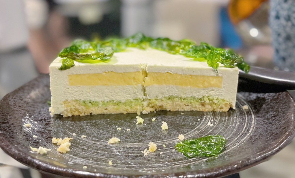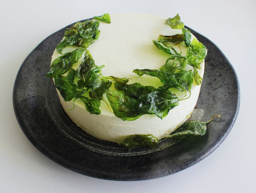 For the components, we have a lemon-olive oil sponge cake base, that is brushed with a basil simple syrup. There is also a disk of lemon curd, which along with the cake, is enrobed in a basil mousse made from aforementioned basil simple syrup. I topped everything with fried basil, just to reiterate that this is a basil-forward dessert. Some things to note about this recipe. The first is that there is a lot of freezing involved. The lemon curd disk, I recommend making that even a day in advanced, since you want it to be frozen solid before you press it into the basil mousse. The basil simple syrup is integral for the entire dessert, being the soak for the cake and the base for the mousse. It is important that you blanch and shock the basil(boil it quickly then throw it into ice), just so that it preserves the bright green color of the leaves. Otherwise if you go with fresh basil straight into the syrup, you’ll end up oxidizing it, and the mousse and syrup will turn an unappetizing shade of rotting leaf-brown. The green color is very subtle in the mousse, but you can definitely still see the coloration of it in the soak, especially when brushed onto the cake! The fried basil, if you don’t want to deep fry, you can always candy it, or even just omit the basil garnish entirely. I like frying basil personally because it gets fragrant, translucent, and adds a crispy texture on top. All in all, this recipe is the perfect treat, being light, summery, and refreshing, despite being a cake!