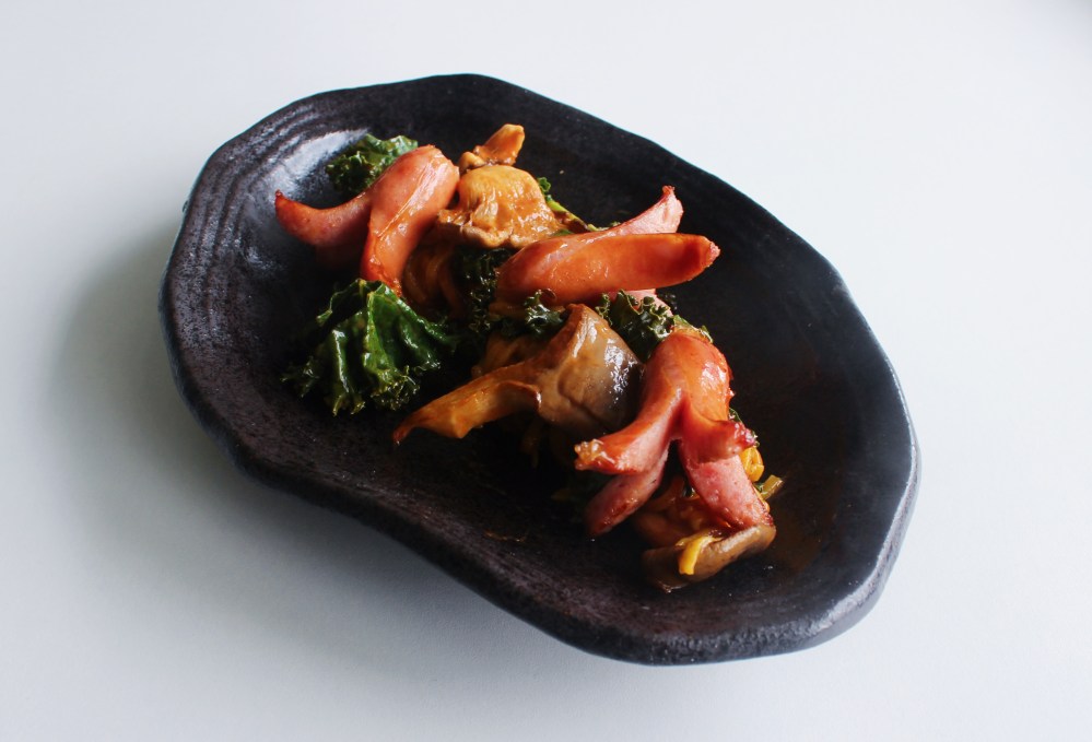 The sauce itself is made using onions, garlic, togarashi, tomato paste, oregano, paprika, and it is eventually finished with some almond milk, which will give it that creamy finish. It is kind of like a tomato bisque, but more cooked down, and with the spices and pork product to break up the monotony of the tomato flavor. I have had tomato bisques in the past where they were just a touch too acidic, and that made the drinking experience of them unpleasant. However, the other ingredients, and the ratio of tomato to aromatics and almond milk, really help to make this a much more pleasant and less overtly tomato-y experience. I also finished the sauce with some kale, green onions, and topped it with roasted oyster mushrooms and some Berkshire sausage. The oyster mushrooms and Berkshire sausage are my nods to the usual Napolitan accompaniments. Just to be silly, I actually cut the sausages to resemble little octopuses, kind of like the ones you would find in Japanese bento boxes. I found that they added a little more motion that way, and they were cute The pasta was made with all-purpose flour, semolina flour, olive oil, water, turmeric, nutritional yeast, and salt. I was experimenting with a vegan pasta dough, so that’s what I went with here. You can totally use a more traditional pasta recipe, or even just dried pasta if you would like! All in all, this recipe came together, pasta-included, in less than an hour, so it is a quick meal that you can prepare during the week!