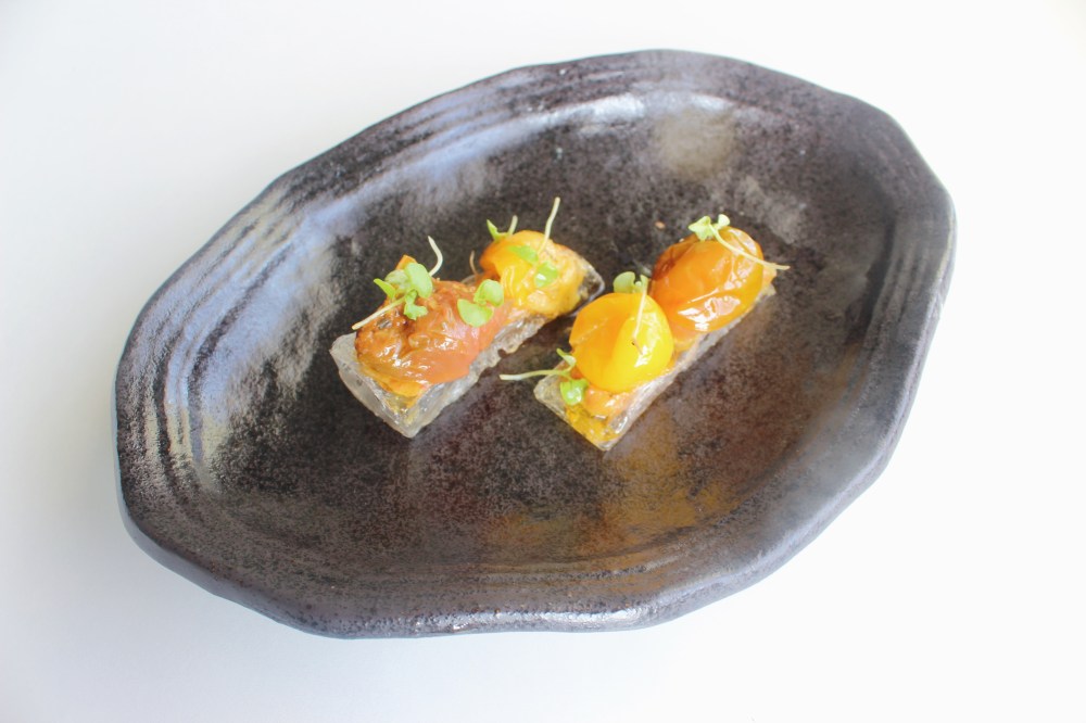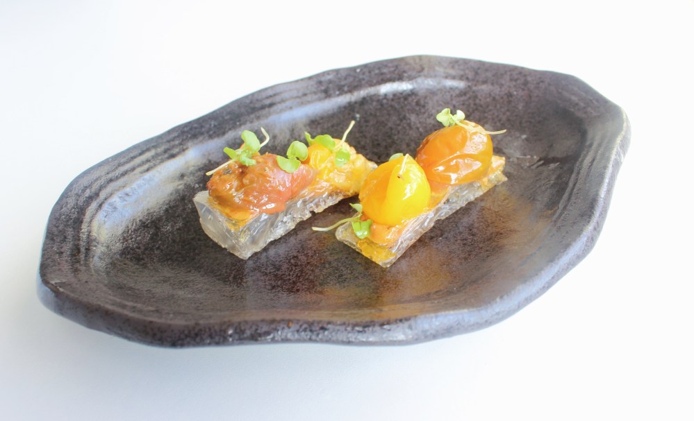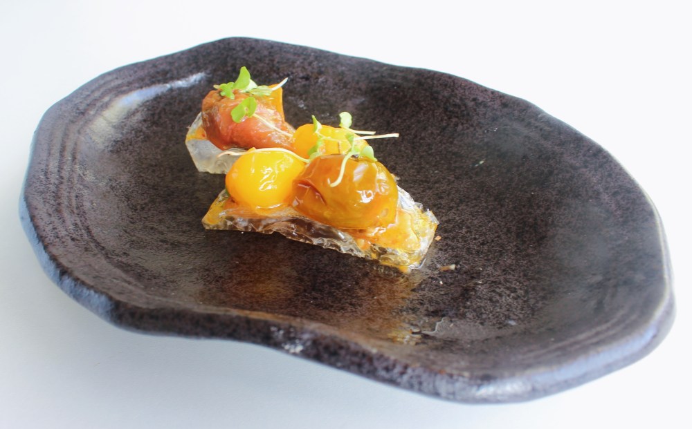 With the tomatoes, I opted to confit them in olive oil, alongside garlic and chilies, just to mellow out the tartness, and focus more on the sweet and umami aspects of the fruit instead. I took some of the confit tomatoes, along with the chilies and garlic that were also mellowed out in that cooking process, and pureed them with a little white balsamic and salt, just to bring some sharpness back into them for a more acidic element for the dish. I also garnished the tops of the crystal bread with some of the confit tomatoes themselves, and micro basil as a way to add in some color, and since basil and tomato pair beautifully together. All in all, this was a relatively challenging recipe, just because of how long the breads have to bake for, and how upsetting it was to waste about 3 hours on that failed first attempt, but when I got a successful batch, it was a. a huge relief, and b. so satisfying to plate these up and see all of those bright colors bounce off of the crystal clear bread crisp that I made. Also fun fact, these are completely vegan and gluten-free, so there is that too!
