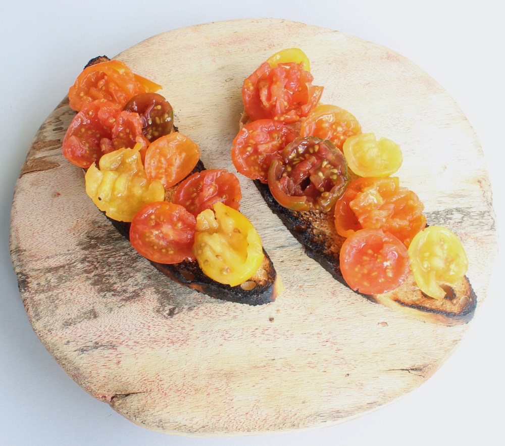 Rub each slice of bread with the garlic clove. Halve the tomatoes, and then using a fork, press them onto the bread slices, and garnish the tops with olive oil and flaky sea salt.