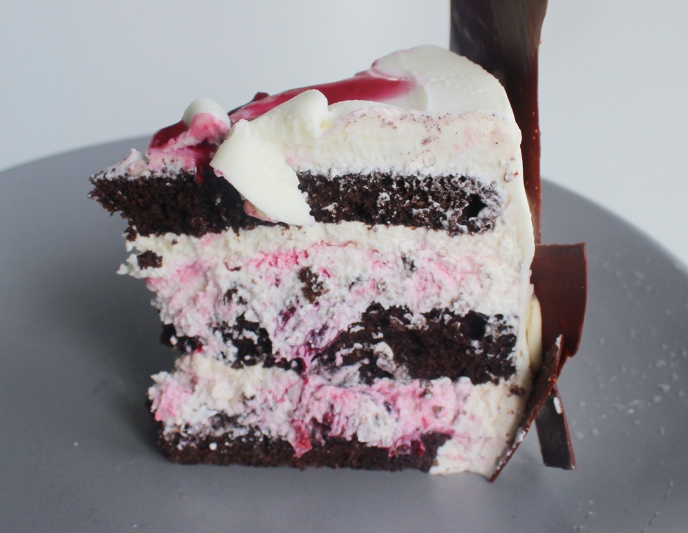 Start by placing down a regular layer of the cake. Brush generously with the soak. Then layer on 2oz of the cream, and about 2 tbsp of the cherry compote. Then repeat these steps using the scrap round as the next layer. Place on the final soaked layer of cake, and then spread on just enough of the cream to coat everything in a thin, even layer. It’s perfectly fine if the cherry mixture bleeds into this cream, as the final cream layer and the chocolate garnishes will cover any of that! Freeze the cake for at least 1 hour before attempting the rest of your assembly.