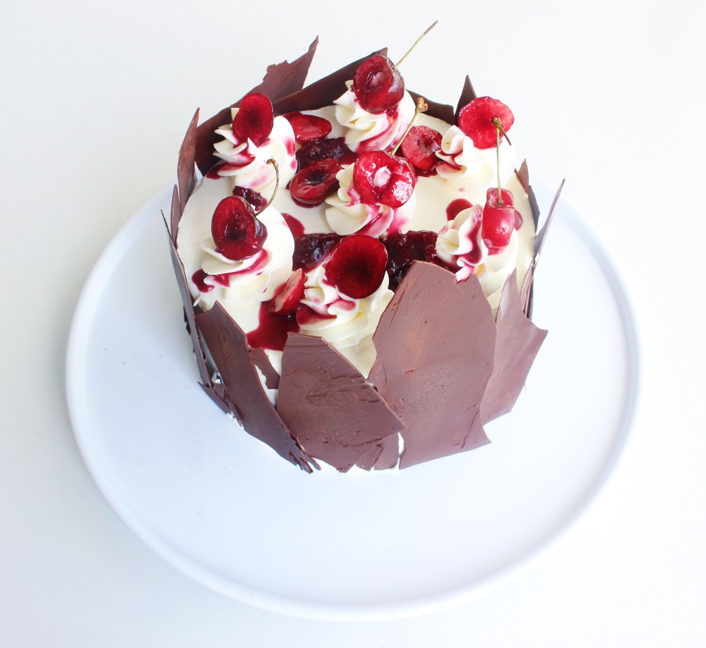 Toss some fresh cherries in the compote, just to glaze them. Spread just enough cream around the cake to coat it in a clean, even layer. Garnish the sides of the cake with shards of the chocolate, and the pipe the rest of the cream on top of the cake. Garnish the top with the glazed cherries to finish!