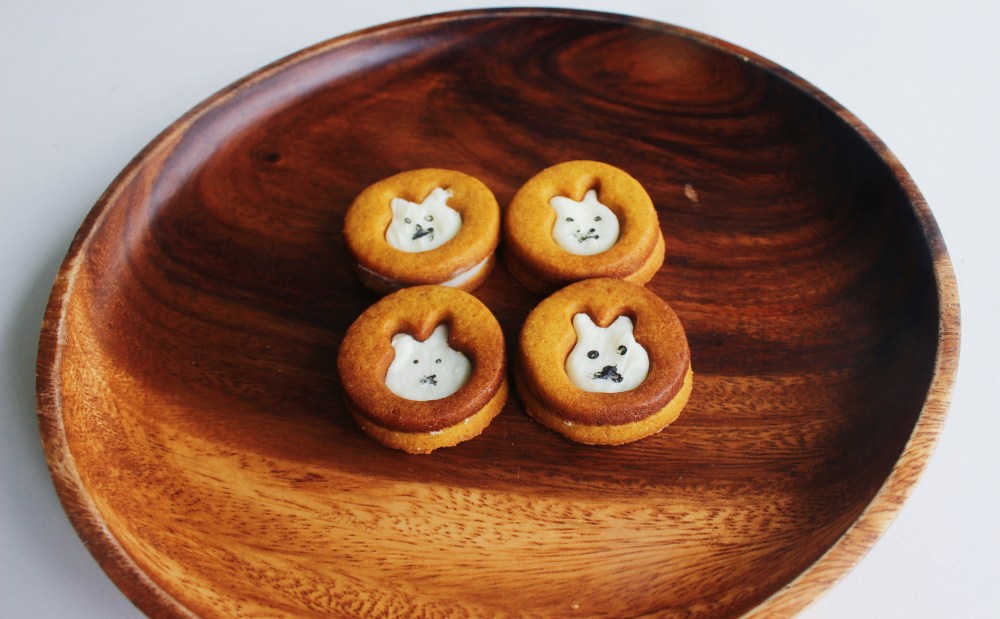 Pipe the filling onto a normal round. Then press onto it a round that has the bunny shape cut out of it. Then using a skewer, draw on the bunny features(eyes and mouth) using the edible paint to finish.