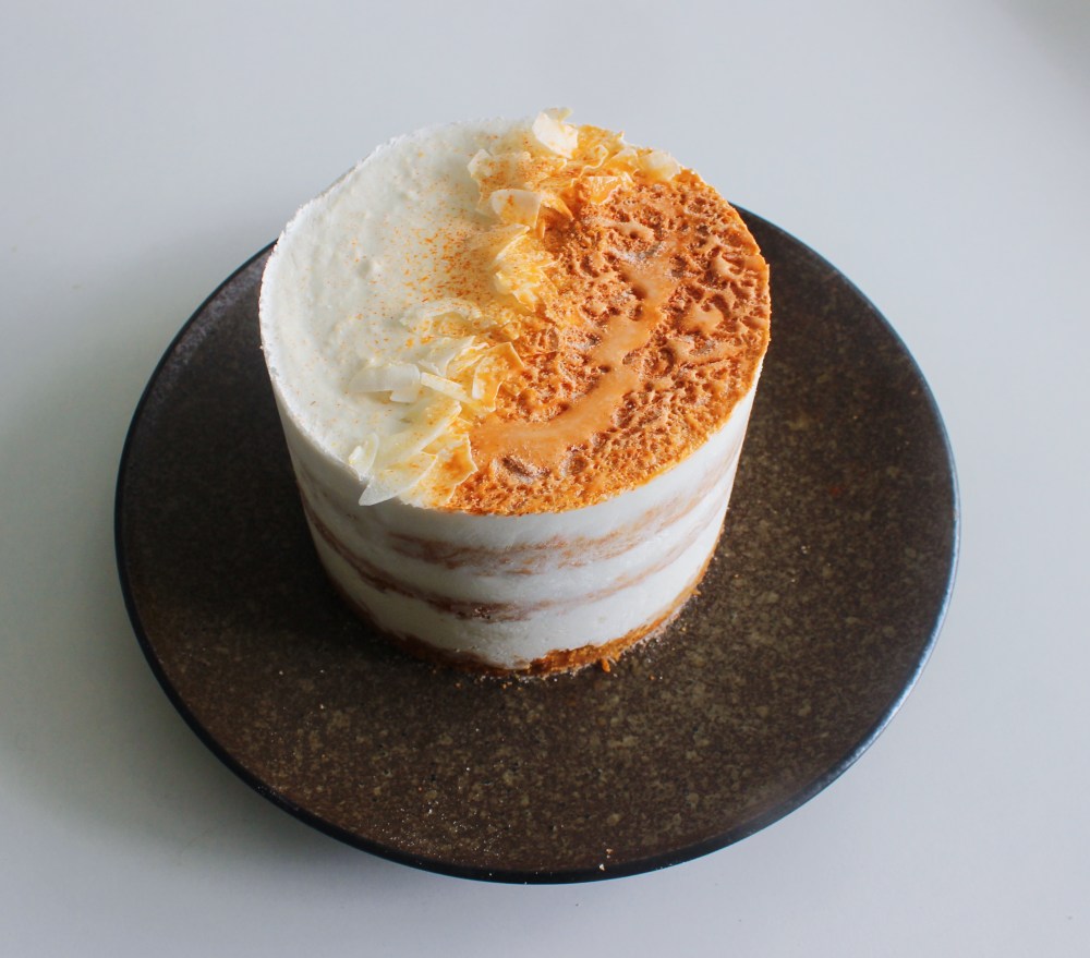 Lined a 6-inch ring mold with acetate and place onto a small enough sheet tray to fit into your freezer. Start by placing down the scrap layer of cake first into the acetate-lined ring mold and pouring 1/3 of the soak over that. Then spread on top of that 1/3 of your halwa, then 1/3 of the cream cheese whip. Repeat these steps for the next two layers of the cake, using your remaining rounds of cake, soak, halwa, and cream cheese whip. Freeze the cake for 2 hours before attempting to unmold.