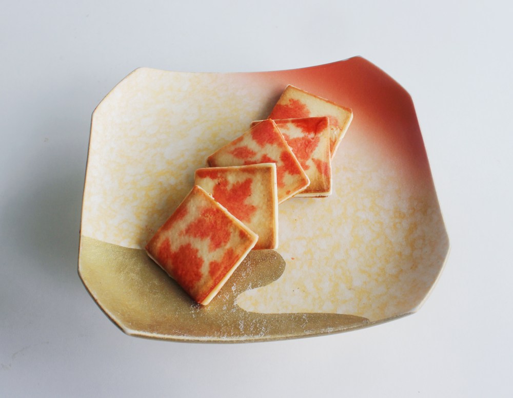 For the dye, I did initially start with using beet root powder instead of red food coloring, but I ran into several issues. The powder, even when finely strained out of the dye, still got caught in the nozzle of my spray bottle. And even when the dye managed to come out, the cookies that I applied the dye to had this weird, jammy red texture on them that hardly resembled the maple leaf pattern I was going for. So I had to nix the beet powder in favor of the red gel food coloring, even though I really wanted that for both the autumnal feel and the natural red color. The other note is that in my initial successful run at making these, I sprayed on the dye last, after I assembled the cookies. However, doing so meant that the dye has less time to dry out and firm up, since there being buttercream between the cookies meant that they could not be reheated or dehydrated for a little bit. For my recipe below, I modified the steps, so that you will be applying the dye on the cookies before assembling them with the buttercream filling. This way, the dyed cookies can be re-baked at a low temperature in the oven, just to set the dye into them. I used alcohol to make that dye mixture anyways, so just a little heat will allow that to evaporate and leave behind just the red maple leaf pattern as intended!