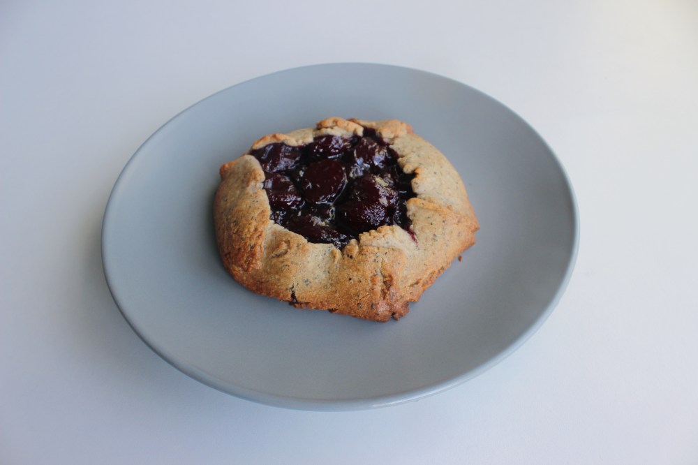 Divide and spread the black sesame layer onto the centers of each 5-inch dough round, leaving about a 1/2 of dough uncovered by this layer. Gently spoon on top of just the black sesame layer the cherry compote. Fold the portions of the dough that aren’t covered in the black sesame layer around the edges of the cherry compote. Bake the crostata at 375 degrees F for 25 minutes. Allow them to cool before serving.