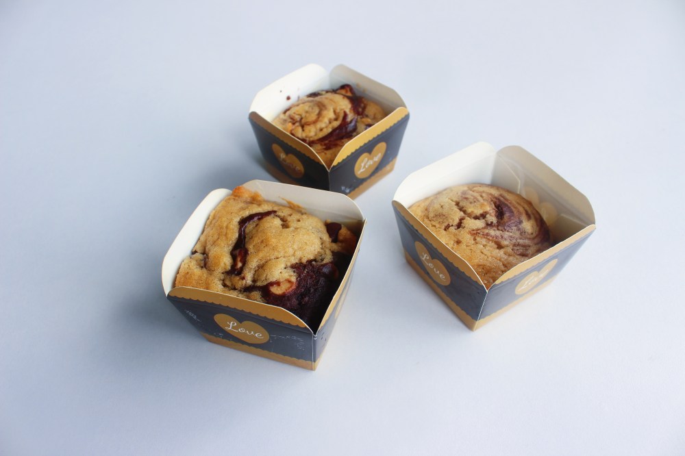 Now that I have settled on a base recipe for my muffins, the next thing was the flavor profile. I thought it would be a fun idea to tackle something more nostalgic, so I went with a peanut butter-chocolate swirl. But since I was able to find peanut butter chips from the grocery store, I wanted to have even more fun with that, by incorporating peanut butter chips into a chocolate dough, and dark chocolate chips into a peanut butter dough! That way, between the two, you can get both flavors running through the muffin as you eat it. I batched out the below recipe in a way where you mix your dry and wet ingredients separately, divide the mixtures into two, and then you can effectively make two batters that way. I highly recommend getting a measuring scale so that you can be very accurate with your portioning. Alternatively, you can also double the recipe, which will result in 18 to 20 muffins, and that might actually be a little bit easier – the only reason why I didn’t is because not everyone owns more than one cupcake tin, and usually a cupcake tin is limited to 12, so that could be a pain to wait for the muffins to bake and cool before adding in the next round of muffins to the pan and oven. I am speaking from personal experience on that, of course, but I circumvented that issue entirely by using those cute box-shaped cupcake liners instead. These muffins are quite tasty and customizable, and if you love peanut butter and chocolate, you will surely love these muffins as well!