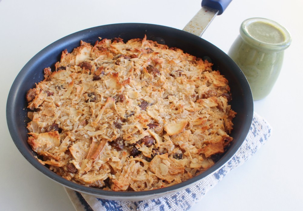 In a bowl, toss together the phyllo, bread, pistachios, raisins, and coconut flakes. In a pot, heat up the milk, sugar, salt, cinnamon, cardamom, and clove first. Once all of those ingredients are dissolved together, stir into that the orange blossom or rose water, and the vanilla extract. Pour that liquid onto the other ingredients and toss until combined. Pour into a shallow baking container(I just used a 6-inch oven-proof nonstick pan) and bake at 350 degrees F for 25 minutes.