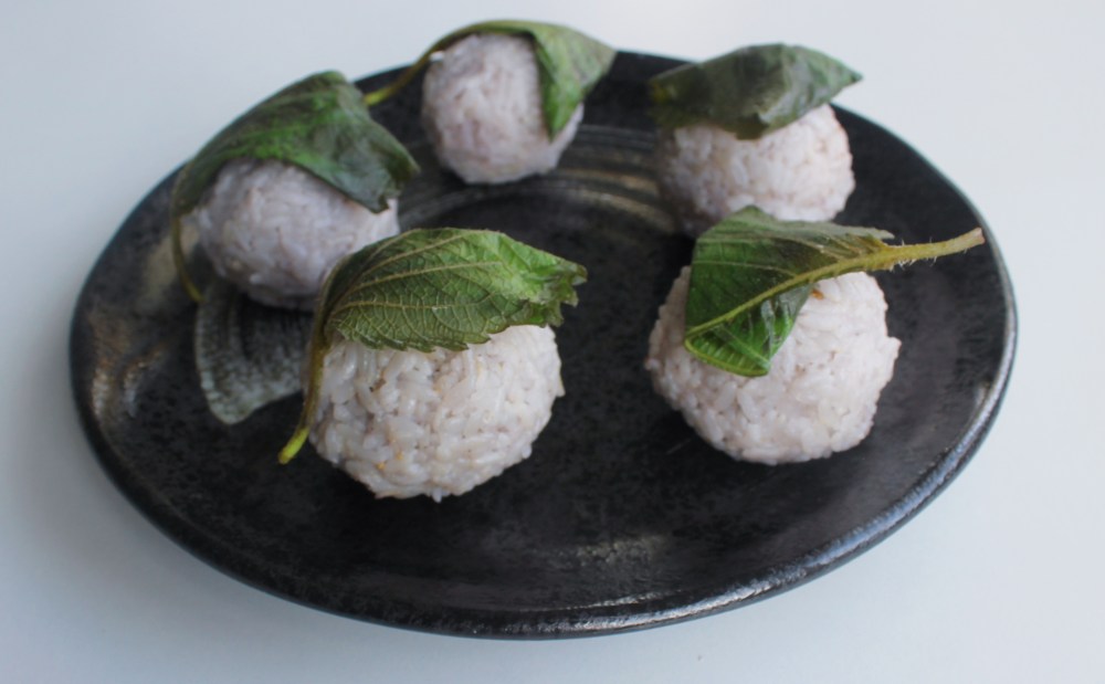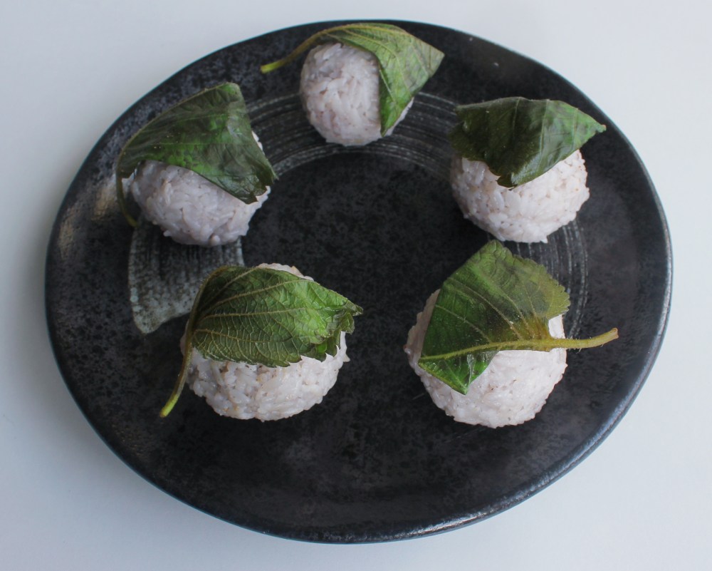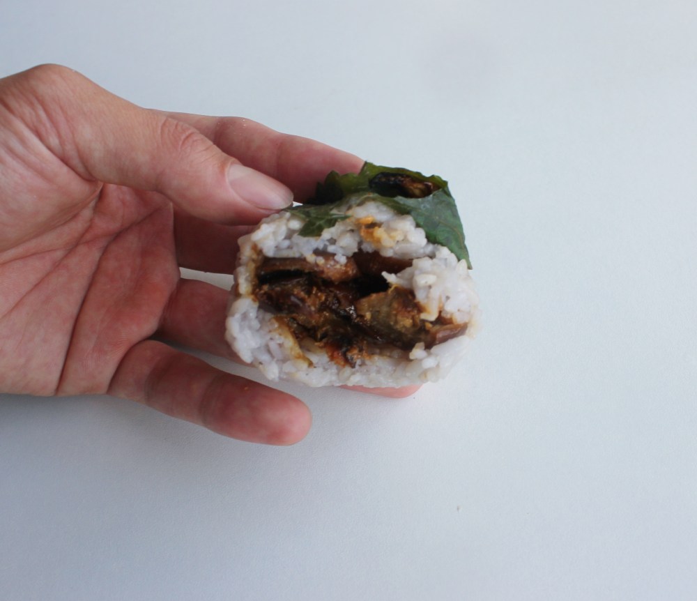 Blanch the shiso leaves in hot water for 10 seconds, then shock it in cold water. Before attempting to touch the rice, be sure to wet your hands with lightly salted water. To assemble, start with about 1oz of your cooked rice. Place about 1 tbsp of the eggplant filling into that and press the rice around the sides of the filling to enrobe it, adding additional rice as necessary. Repeat with the remaining onigiri first. With any leftover eggplant, wrap it into the shiso leaves, and garnish the tops of your onigiri with those!