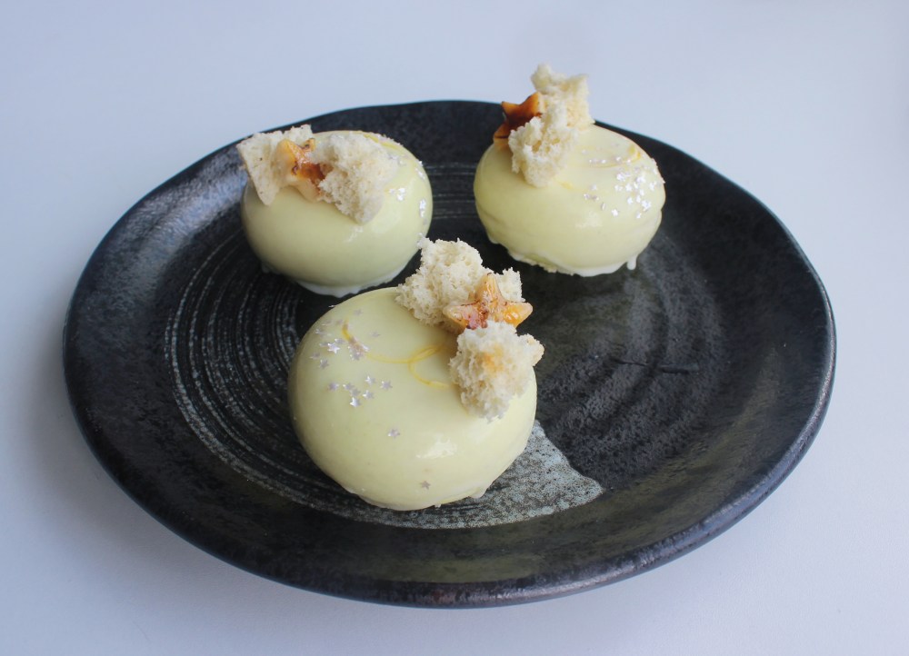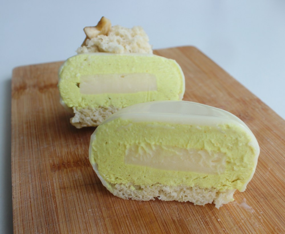 There are quite a few components that go into this dessert, but I will say that they are relatively easy to put together. We have a yuzu curd insert, a banana pudding mousse, white sesame microwave sponge, a yuzu mirror glaze, and bruleed banana “stars”. Similar to the blood moon petit gateau, these require a lot of patience. Making sure that the curd insert is frozen solid before pressing into the mousses, and making sure that the mousses are frozen solid before glazing are key. The microwave cakes come together really quickly, especially if you have a stand mixer to whip the egg white with, and I used microwave proof cardboard cupcake liners for my cakes, but any microwave-safe paper cup can work too! Since fresh yuzu is really hard to come by in the States, I substituted some of that with Yuzu Inspiration, which is a yuzu-flavored chocolate form Valrhona. With the banana pudding, I usually use turmeric in my banana pudding to give it a stronger yellow color/remove the ugly gray color of cooked down banana, and that could cause the banana pudding to have an almost mustard-yellow color as a side effect. However, folding the cream into that causes the banana pudding to take on a light yellow color that is very aesthetically pleasing! You can also use yellow food coloring instead of the turmeric, since the turmeric flavor does come through really lightly. With the bruleed bananas, I used a blowtorch on a really low setting to carefully caramelize the sugar, but even just doing star-shaped banana slices without the brulee can work in a pinch if you are serving these cakes right away(otherwise the banana slices will oxidize and turn a gray-brown).
