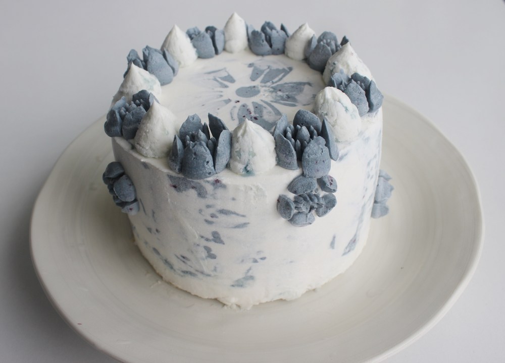 Start by applying a crumb coat onto the cake using the un-dyed buttercream. Return the cake to the freezer for 30 minutes, then spread on another smoother layer of the un-dyed buttercream. Take about 1/4 of the remaining un-dyed buttercream and stir in the dot of gel food coloring. Using floral-patterned stencils, spread the blue buttercream around the cake. Freeze the cake for another 30 minutes before spreading on the un-dyed buttercream. Freeze the cake for another 30 minutes, then using a warmed bench scraper, gently shave off the un-dyed buttercream to expose the blue floral patterns – reserve the scraped buttercream and transfer that to a piping bag with a round piping tip. Any spare blue buttercream, transfer to a piping bag with a floral piping tip. Pipe a border of the buttercream on top of the cake, and optionally, pipe dots of the buttercream around the sides of the cake as well. Allow the cake to freeze for at least 1 more hour before transferring to a serving surface.